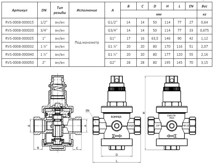 Редуктор давления Rommer 1 1/2" PN25 с выходом под манометр, внутренняя резьба (RVS-0008-000040)