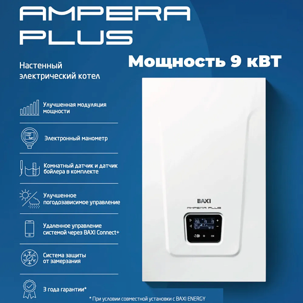 Электрический котел BAXI AMPERA Plus – это современная мини-котельная, которая включает: расширительный бак, насос и группу безопасности. Модельный ряд начинается с котлов мощностью 6 и 9 кВт, они могу быть как однофазными, так и трехфазными. Модели от 12 до 36 кВт поставляются в трёхфазном исполнении. Одним из ключевых усовершенствований в новых моделях является улучшенная модуляция мощности.