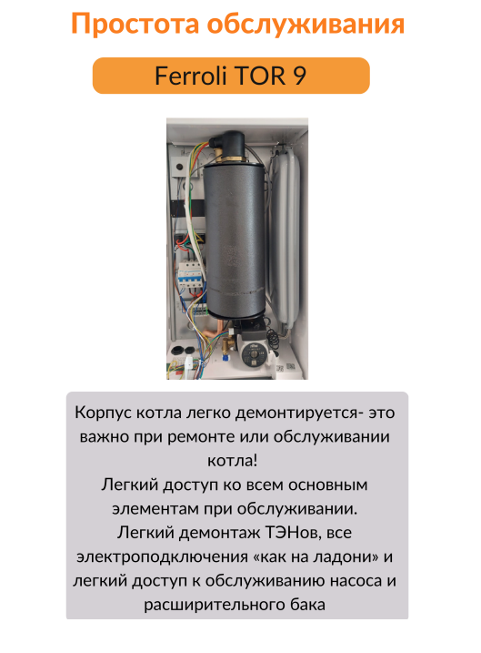 - Бесшумная работа (за счет использования в котле твердотельных реле) - Простота эксплуатации - Приоритет ГВС - Регулировка t o отопления и горячей воды - Модуляция мощности - Ротация тэнов - 3-скоростной циркуляционный насос Ferroli - Система самодиагностики - Система защиты от замерзания - Дополнительные возможности: - Подключение датчика уличной температуры (погодозависимая автоматика) - Подключение бойлера косвенного нагрева - Подключение комнатного термостата ON/OFF - Подключение комнатного пульта управления OpenTherm - Управление котлом через приложение в телефоне (CONNECT) Функции котла. Нагрев теплоносителя системы отопления: - установка температуры отопления, индикация установленной и реальной температуры. - индивидуальное отключение контура отопления - поддержание температуры в режимах «Контроль» и «Равновесие» - работа в погодозависимом режиме - работа с комнатным термостатом, - режим (отключаемый) предварительного стравливания воздуха из системы отопления «FH» Нагрев бойлера косвенного нагрева (с датчиком NTC): - управление трёхходовым краном «отопление – ГВС» - установка температуры воды в бойлере, индикация установленной температуры. - индивидуальное отключение контура ГВС - режим «Антилегионелла» (отключаемый, программируемый) Защитные функции - защита от перегрева: - при срабатывании предельного термостата - при достижении предельной температуры - контроль минимального давления в системе отопления - контроль максимального давления в системе отопления - защита от замерзания (двухступенчатая).