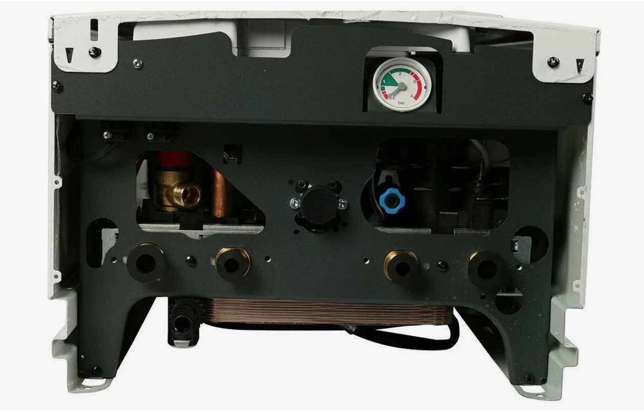 Данная модель отличается компактными размерами, однако совмещает в себе два раздельных теплообменника на отопление и ГВС.