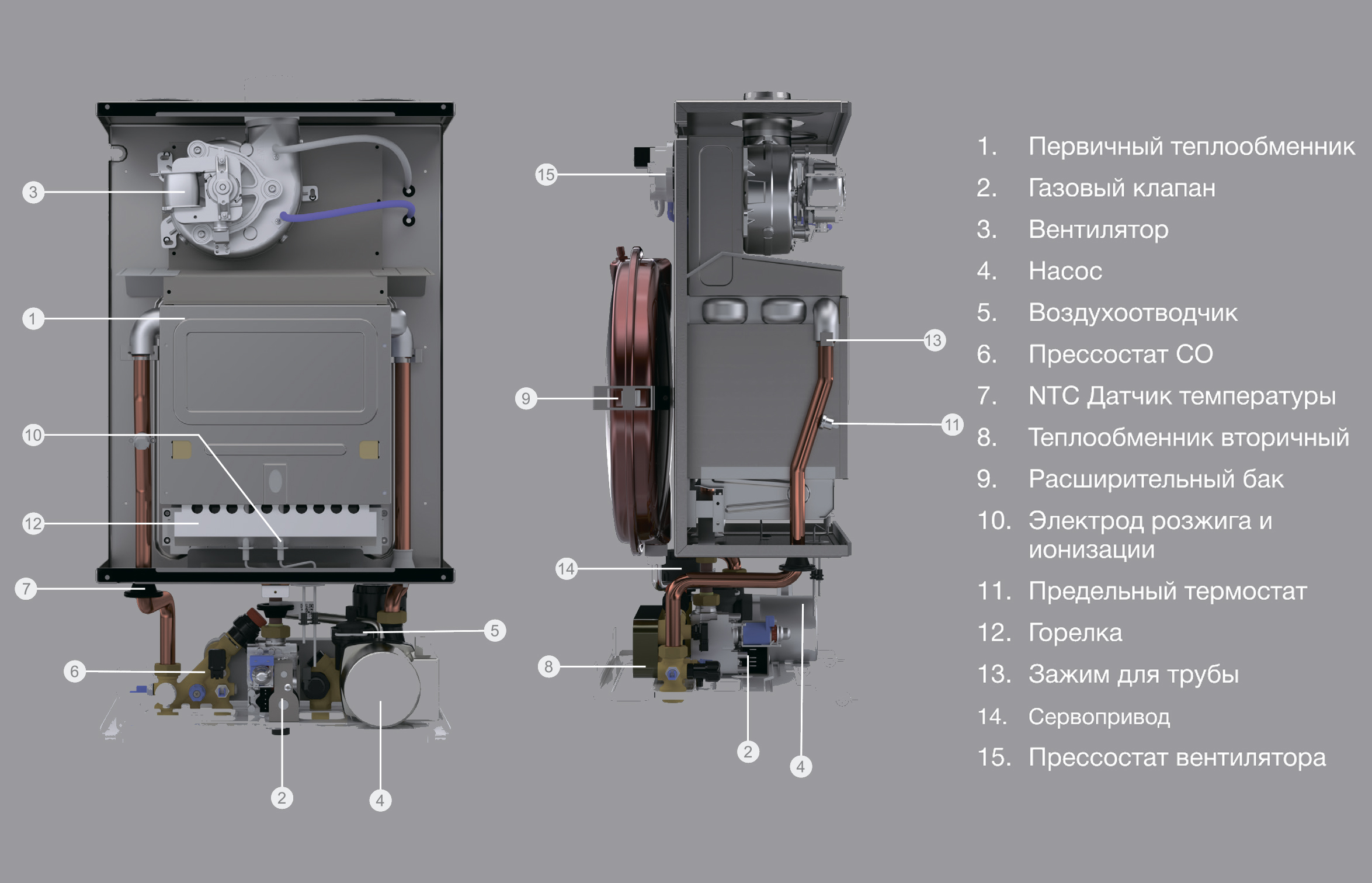 - Предохранительное устройство предотвращает перегрев теплообменника благодаря системе автоматического байпаса и задержке выключения насоса в режиме отопления