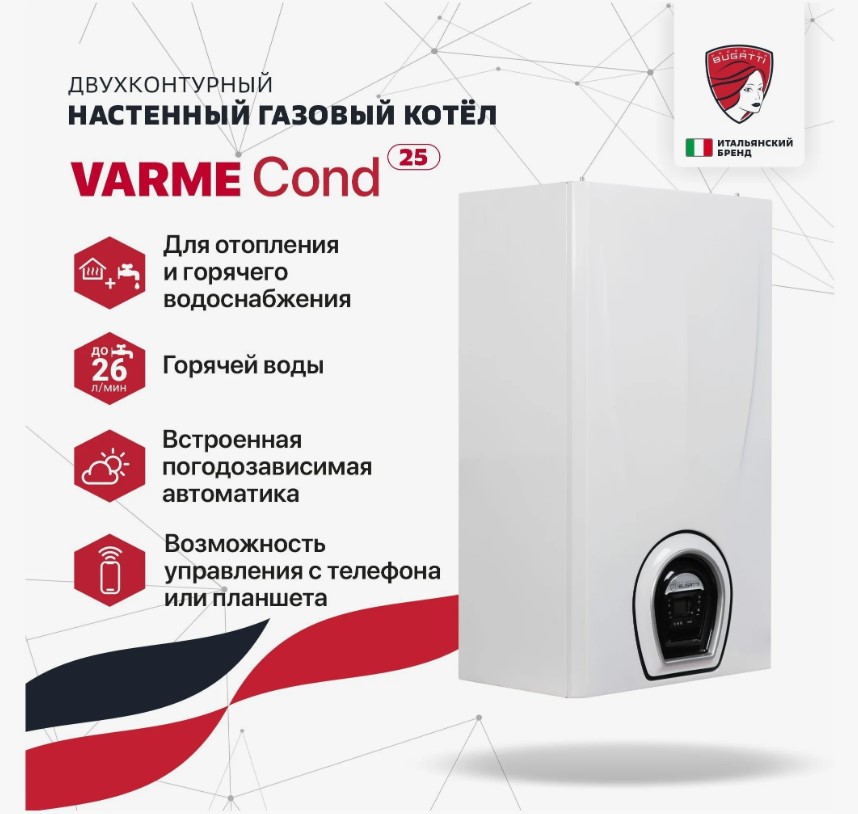 - ₽Конденсационный газовый котел Federica Bugatti Cond 25B одноконтурный с закрытой камерой сгорания - высокопроизводительное оборудование. КПД 102%. Обеспечивает максимальный комфорт, простоту использования и обслуживания. Несмотря на габаритные размеры, котлы обладают высокой мощностью. Экономят топливо до 35% в сравнении с обычными котлами. Обеспечивают низкий уровень шума. На 70% экологичнее традиционных котлов. Низкая температура отводящих газов позволяет устанавливать пластиковые дымоходы, которые значительно дешевле и проще в монтаже. Пятилетняя гарантия подтверждает высокое качество котла.