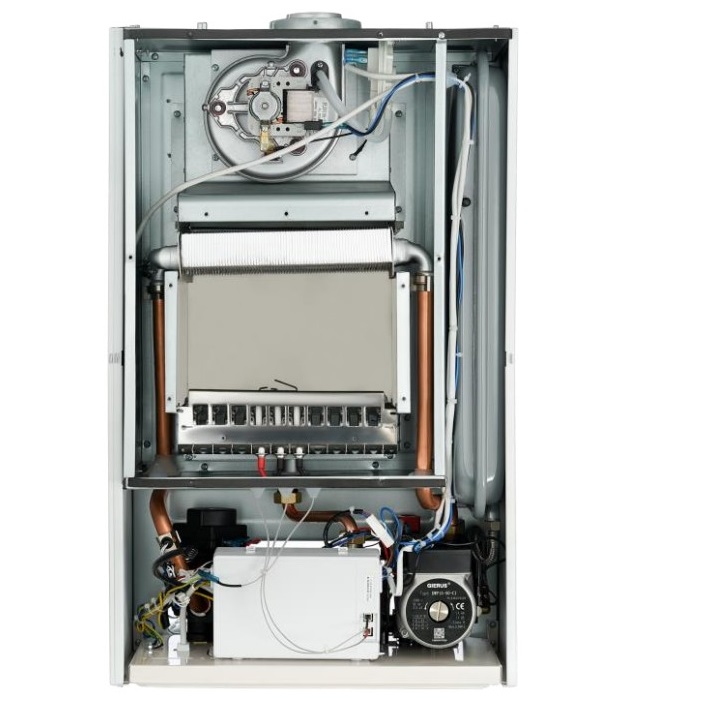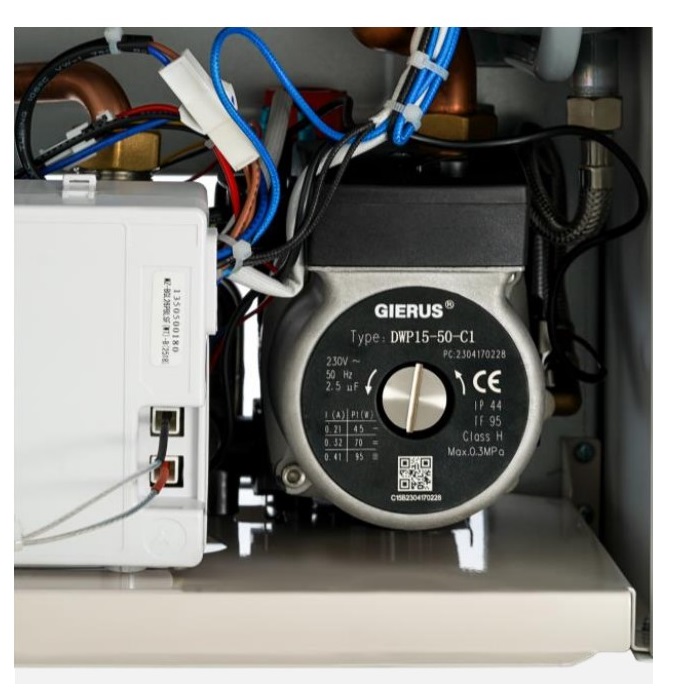Газовый настенный котёл GIERUS ES 32/1 двухконтурный с закрытой камерой сгорания оборудован удобной, интуитивно понятной панелью управления с вращающимися регуляторами и ярким, информативным дисплеем. Патрубки подключения отопления, ГВС и газоснабжения расположены по «европейской» схеме. На нижней панели также расположен манометр и кран подпитки системы отопления. В котлах Gierus используется битермический теплообменник, вторичный теплообменник изготовлен из нержавеющей стали. Все компоненты газовых настенных котлов Gierus были тщательно подобраны и проверены специалистами компании. Каждый котёл проходит тестирование при производстве, что обеспечивает стабильное качество и надёжность. Бесшумный, энергосберегающий, надёжный трёхскоростной циркуляционный насос снабжён автоматическим воздухоотводчиком.