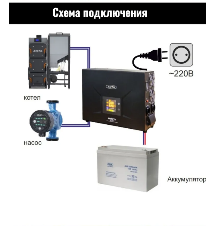 Об изделии Инвертор (Источник бесперебойного питания) обеспечивает стабильное и бесперебойное напряжение в случае полного отключения сети питания. В случае отключения от сети, переключение на работу с использованием инвертора происходит автоматически. Предназначен для работы с насосами, автоматическими котлами и бытовыми приборами в диапазоне мощности от 300 до 5000 Вт. Подходит для: Автоматический котел «Стаханов» Пеллетный котел Pellet S Универсальный котел Maxima Универсальный котел Optima Полуавтоматический котел Magna Пеллетная горелка Fox Комплект автоматики Turboset Насосы Ring Насосы EcoRing Бытовые приборы и другое котельное оборудование Ключевые преимущества Мощностной ряд: 300, 500, 600, 1050, 1400, 1800, 2100, 3500, 5000 ватт. ИБП «Matrix» выдает чистый синус (волнистый сигнал), который необходим для правильной работы насосов и блоков управления. Использование других видов сигналов (меандр, модифицированный синус) может пагубно сказаться на работе устройств – они могут издавать шумы, а в процессе продолжительного использования вовсе прекратят свою работу. Встроенный сетевой фильтр подавляет высокочастотные помехи. Встроенный стабилизатор напряжения. Позволяет сэкономить на отдельном стабилизаторе и получить стабильное напряжение на выходе. Так же обеспечить защиту от скачков напряжения и перегрузок. Для увеличения срока эксплуатации аккумуляторов присутствует защита от полного разряда. Аккумулятор не разряжается ниже допустимого уровня, и не деформируется внутри. Применена интеллектуальная система заряда АКБП. ИБП постоянно измеряет напряжение на клеммах и по скорости увеличения заряда постепенно снижает ток, подающийся на аккумулятор. Заряд при этом становится плотнее. Повышенный ток заряда (в 10-15 ампер) позволяет устройству заряжать аккумуляторы любой емкости. Дисплей устройства информативен и показывает входное, выходное напряжение, индикацию подключенной мощности.