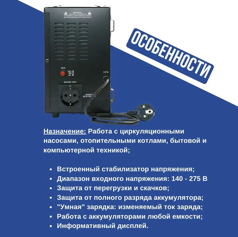 • Встроенный стабилизатор напряжения. Позволяет сэкономить на отдельном стабилизаторе и получить стабильное напряжение на выходе. Так же обеспечить защиту от скачков напряжения и перегрузок.