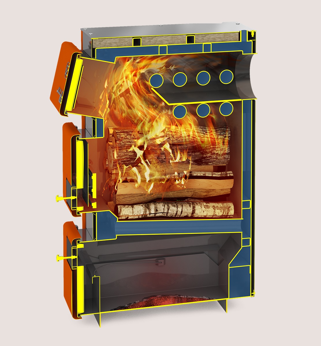 Самоохлаждаемая топочная дверца исключает риск случайного ожога.
