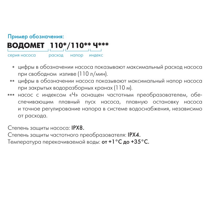 Степень защиты IPX8 (насос), IPX4 (частотный преобразователь)