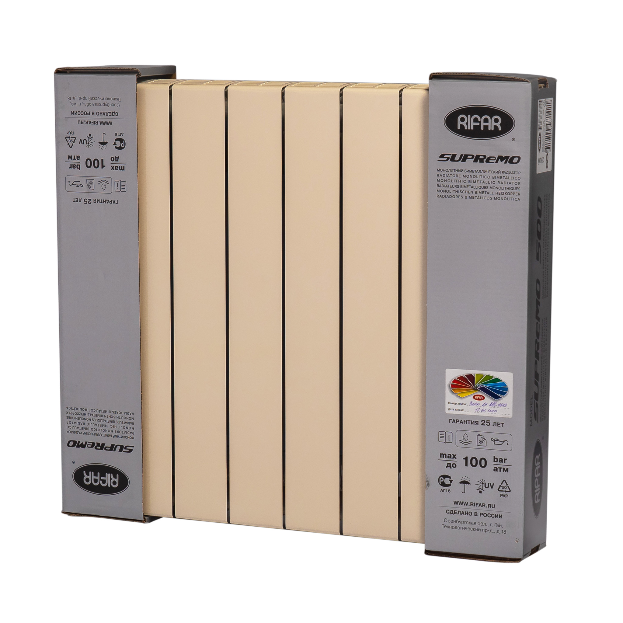 Rifar Supremo 500. Надежный, мощный и стильный радиатор. Тип радиатора - секционный. Конструкция - настенная. Материал - биметаллический. Подключение - боковое.