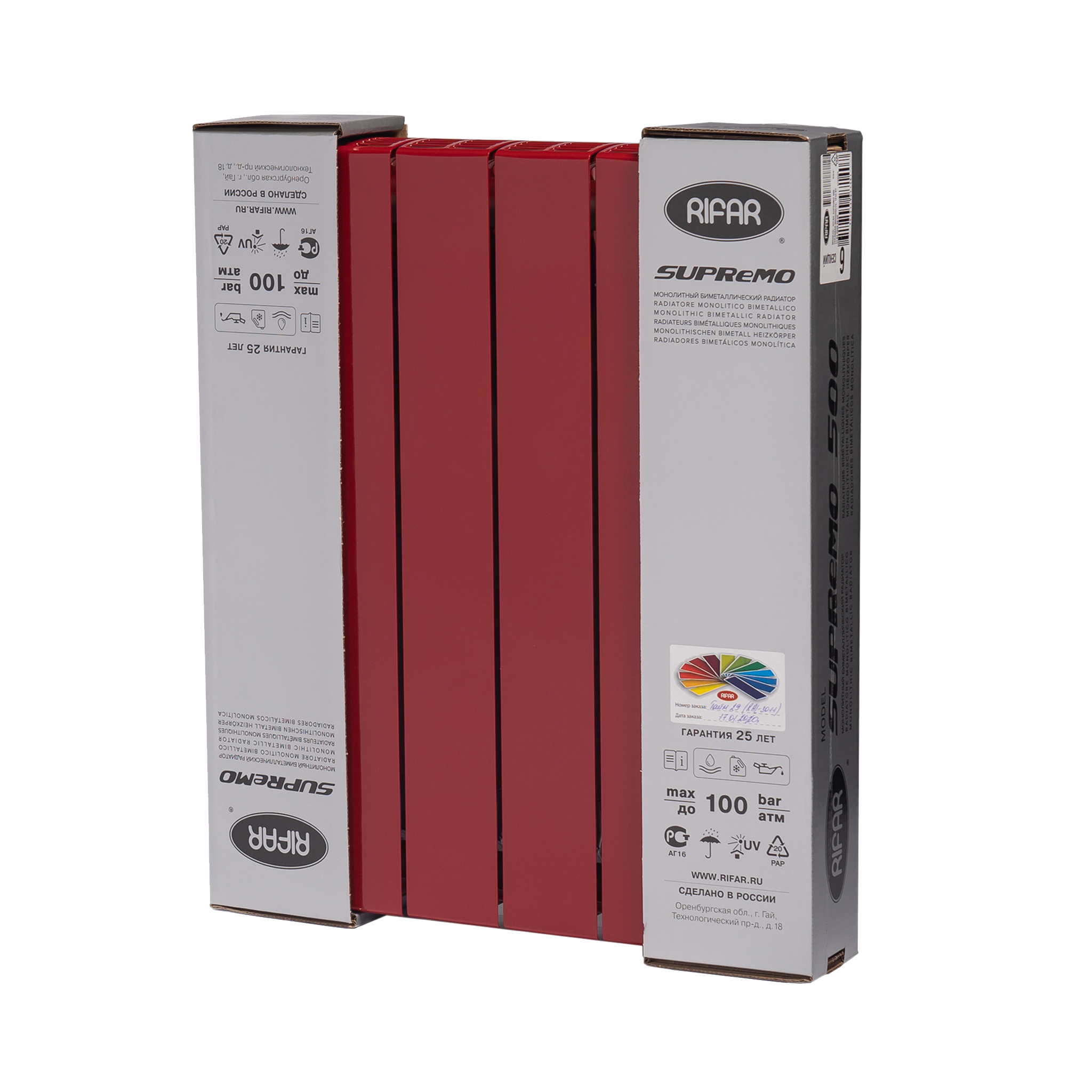 Rifar Supremo 500. Надежный, мощный и стильный радиатор. Тип радиатора - секционный. Конструкция - настенная. Материал - биметаллический. Подключение - боковое.