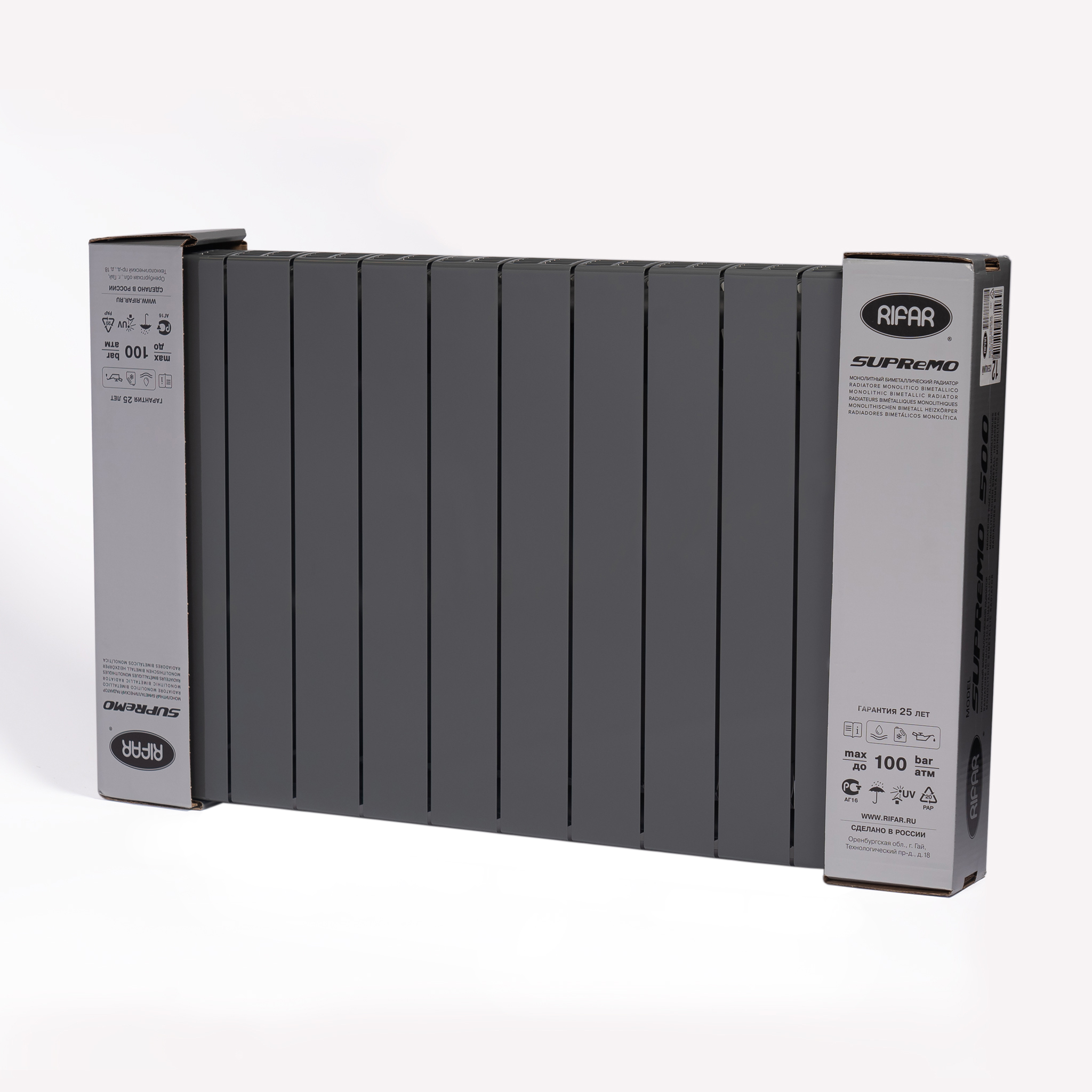 Rifar Supremo 500. Надежный, мощный и стильный радиатор. Тип радиатора - секционный. Конструкция - настенная. Материал - биметаллический. Подключение - боковое.