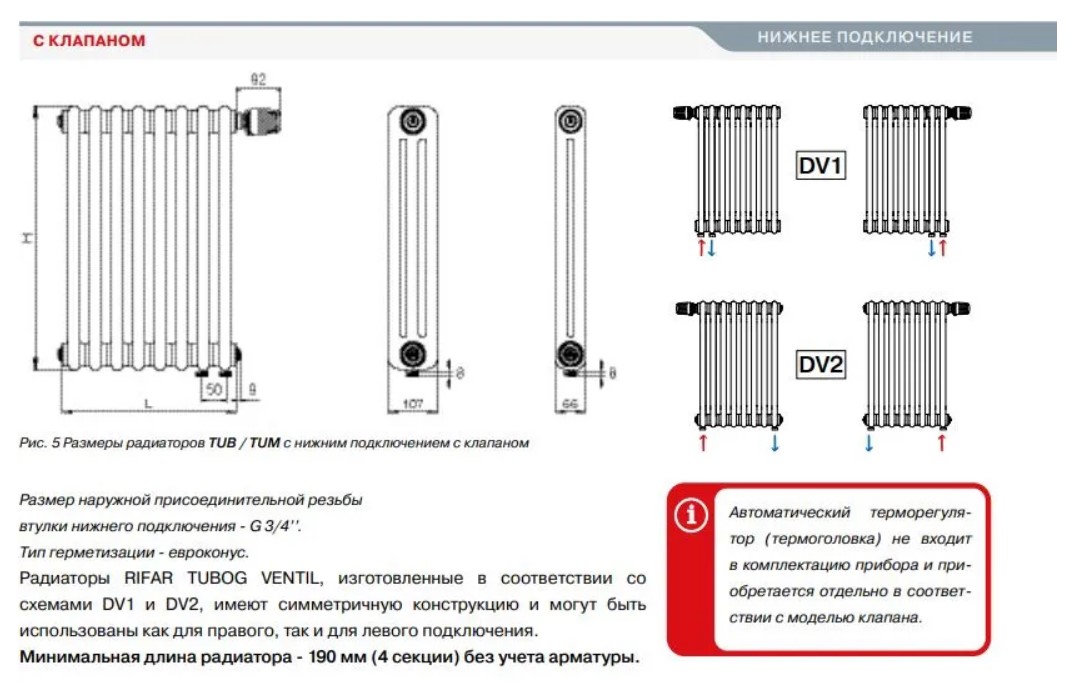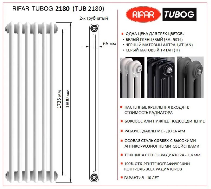 Трубчатый радиатор Rifar Tubog Ventil DV1 2180 6 секций белый, с нижним подключением