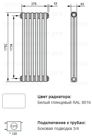 Радиатор Zehnder Charleston 2180 боковое подключение №1270, 3/4", RAL 9016 (белый) представляет собой стальной трубчатый радиатор белого цвета. Радиатор Zehnder Charleston 2180 является двухтрубным, т.е. профиль одной его секции состоит из 2 труб. При этом глубина радиатора 62 мм.