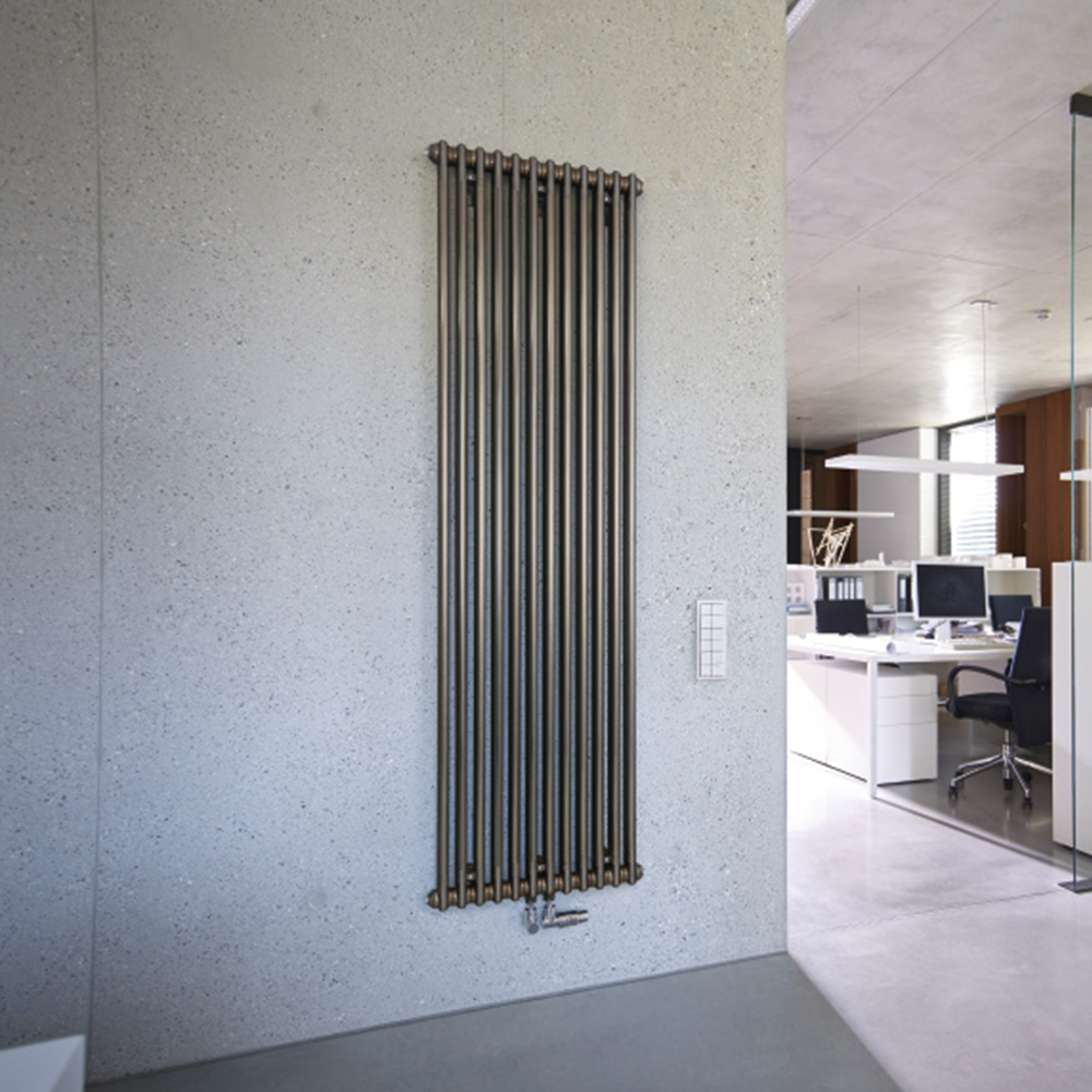 Вертикальные радиаторы всё чаще используются в качестве замены традиционных громоздких батарей. Высокий и узкий радиатор будет занимать мало места, его можно разместить в проёмах между панорамными окнами и на торцах стен. Он гармонично впишется в пространство Вашего дома, обеспечив его теплом и став украшением интерьера. Устанавливать вертикальный радиатор следует только на капитальную стену, способную выдержать большой вес изделия вместе с теплоносителем.
