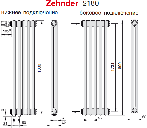 Радиатор Zehnder Charleston Completto 2180 V001 Technoline нижнее подключение представляет собой стальной трубчатый радиатор цвета Technoline (прозрачный лак). Вес изделия составляет 2,73 кг/секция без учёта веса теплоносителя. Радиатор Zehnder Charleston Completto C2180 является двухтрубным, т.е. профиль одной его секции состоит из 2 труб. При этом глубина радиатора 62 мм.