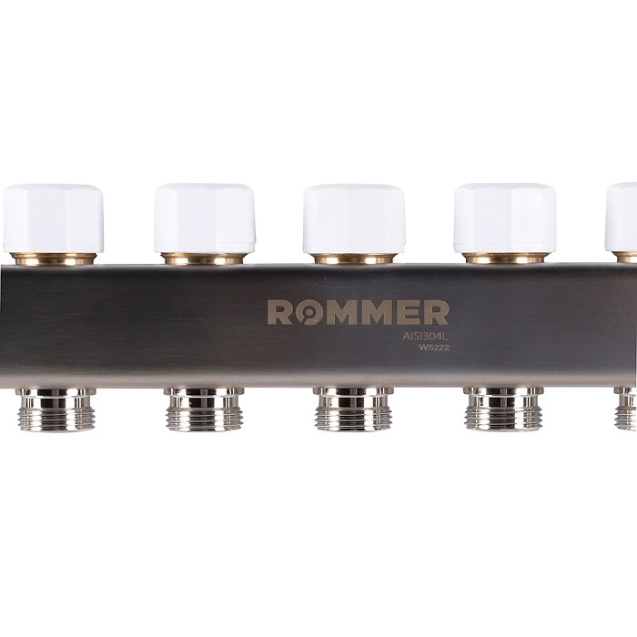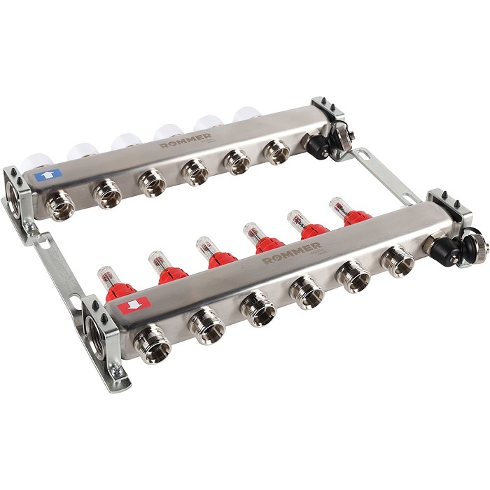 Распределительный коллекторный блок Роммер состоит из подающего и обратного коллектора, каждый из которых имеет от 2 до 12 выходов.