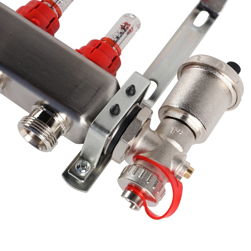 • Для обеспечения требуемых расходов теплоносителя по отдельным циркуляционным контурам системы отопления подающий распределительный коллектор оснащается ручными запорно-балансировочными клапанами или балансировочными расходомерами. Эти устройства позволяют сдросселировать при расчетных расходах теплоносителя излишние перепады давления в контурах, которые выявляются в ходе гидравлического расчета системы отопления и должны указываться в проектной документации.