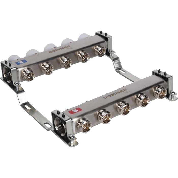 Коллектор Rommer 1"x3/4" на 5 контуров с запорными клапанами из нержавеющей стали (RMS-3200-000005) предназначен для улучшения производительности систем отопления зданий за счёт равномерного распределения теплоносителя по контурам.