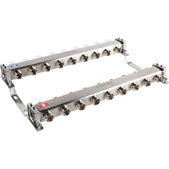 Распределительный коллекторный блок Роммер состоит из подающего и обратного коллектора, каждый из которых имеет от 2 до 12 выходов.