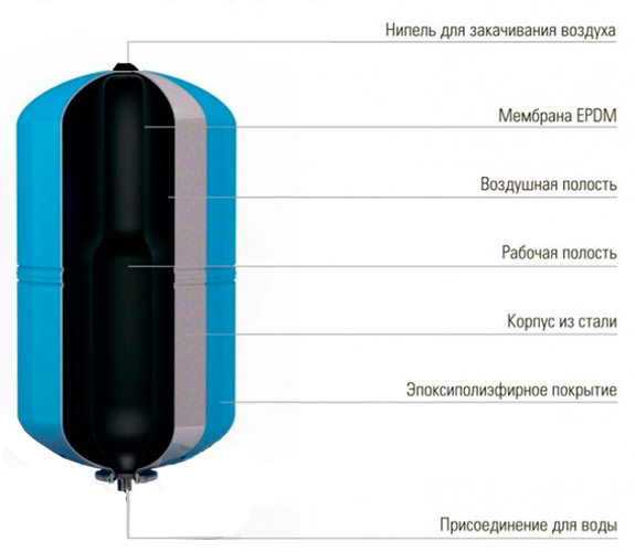 Корпус бака изготовлен из высококачественной углеродистой стали с эпоксиполиполиэфирным наружным покрытием синего цвета (RAL 5015) и рассчитан на многолетнюю эксплуатацию. Заменяемая мембрана выполнена из EPDM. Мембрана разделяет бак на две камеры: воздушную (полость между металлическим корпусом и мембраной) и водяную (внутренняя полость самой мембраны). Вода находится внутри мембраны и не контактирует с металлическими стенками бака. Материал ниппеля - латунь. Контрфланец выполнен из углеродистой стали с цинковым покрытием.