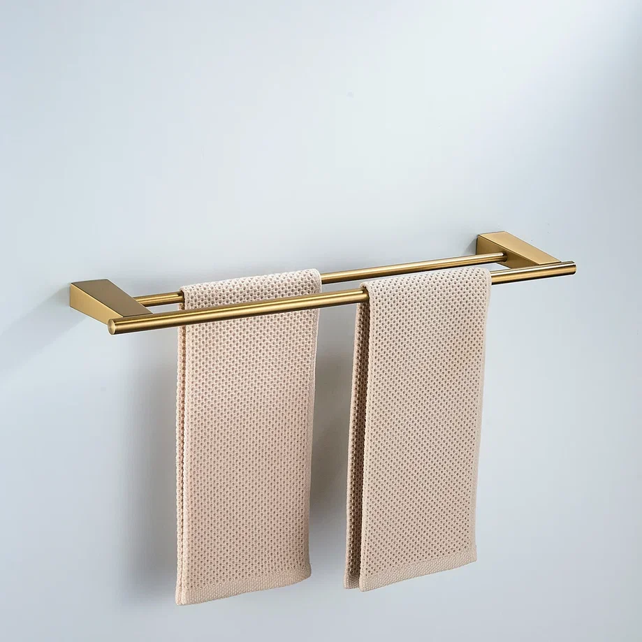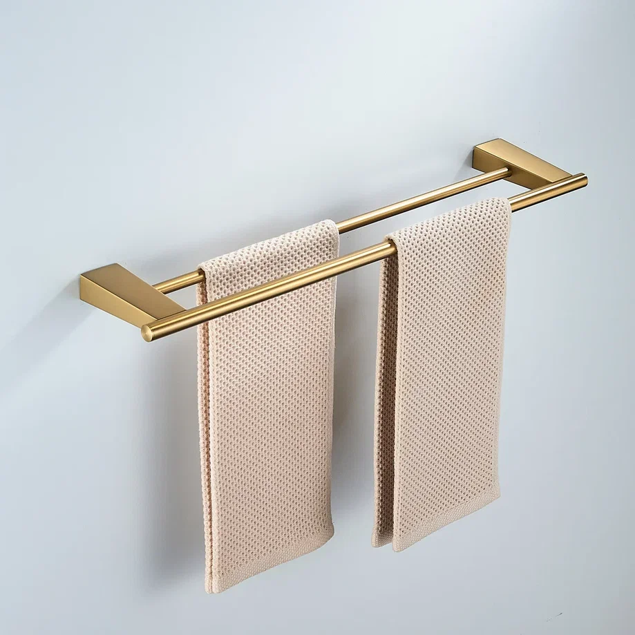 Держатель для полотенец Shevanik SG5727G в современном цвете "золотой сатин" (брашированное золото) — это стильное и функциональное решение для вашей ванной комнаты или кухни. Конструкция в виде двух перекладин обеспечивает удобство использования и позволяет эффективно разместить несколько полотенец, сохраняя порядок и оптимизируя пространство. Изготовленный из прочной нержавеющей стали, держатель гарантирует долговечность и устойчивость к влаге, что делает его идеальным выбором для помещений с повышенной влажностью. Современный минималистичный дизайн делает этот аксессуар универсальным элементом интерьера, который гармонично впишется в любой стиль. Настенный монтаж обеспечивает простоту установки, а комплект, включающий как саморезы, так и дюбели, позволяет выбрать оптимальный способ крепления в зависимости от типа стены. Держатель Shevanik не только удобен в использовании, но и служит элегантным дополнением к общему дизайну помещения, подчёркивая ваш безупречный вкус.