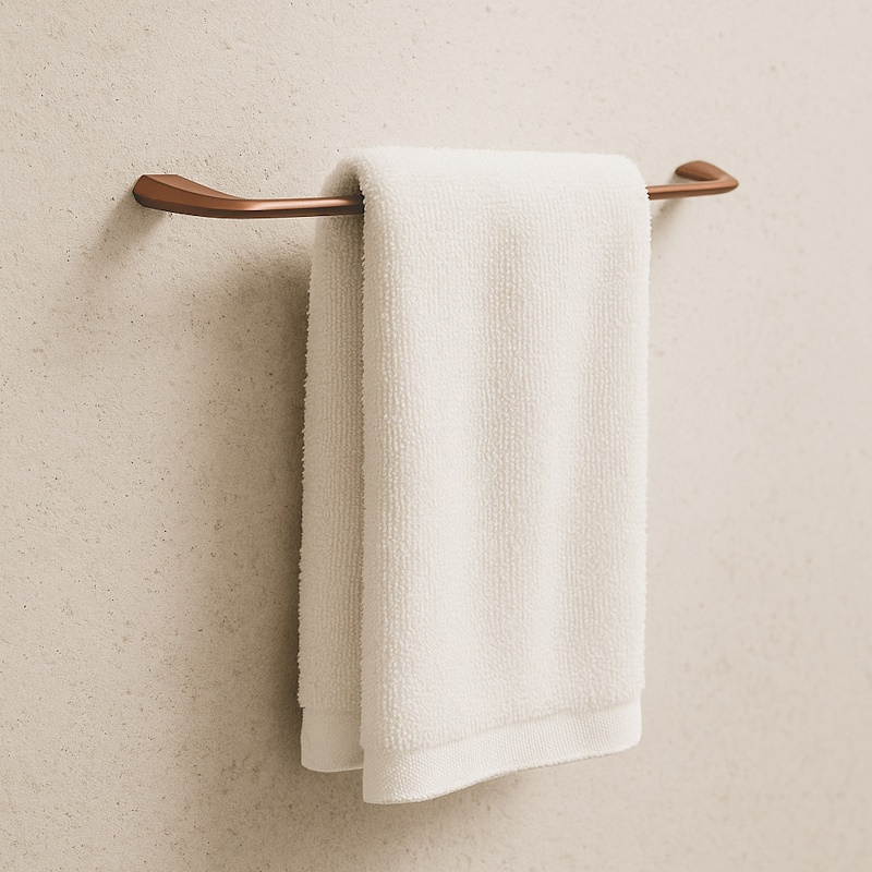 Современный держатель для полотенец в бронзовом цвете добавляет ванной тёплый и стильный акцент. Изготовлен из ZAMAK + нержавеющей стали SUS-201 для надёжности и защиты от коррозии. Матовая поверхность с антиследовым покрытием легко поддерживается в чистоте.