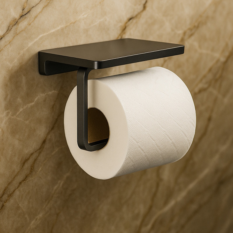 Черный матовый держатель туалетной бумаги — идеальный баланс стиля и комфорта. Полочка для телефона или аксессуаров превращает ванную в организованное пространство. Прочный сплав ZAMAK, антиследовое покрытие, быстрый монтаж — всё для вашего удобства.