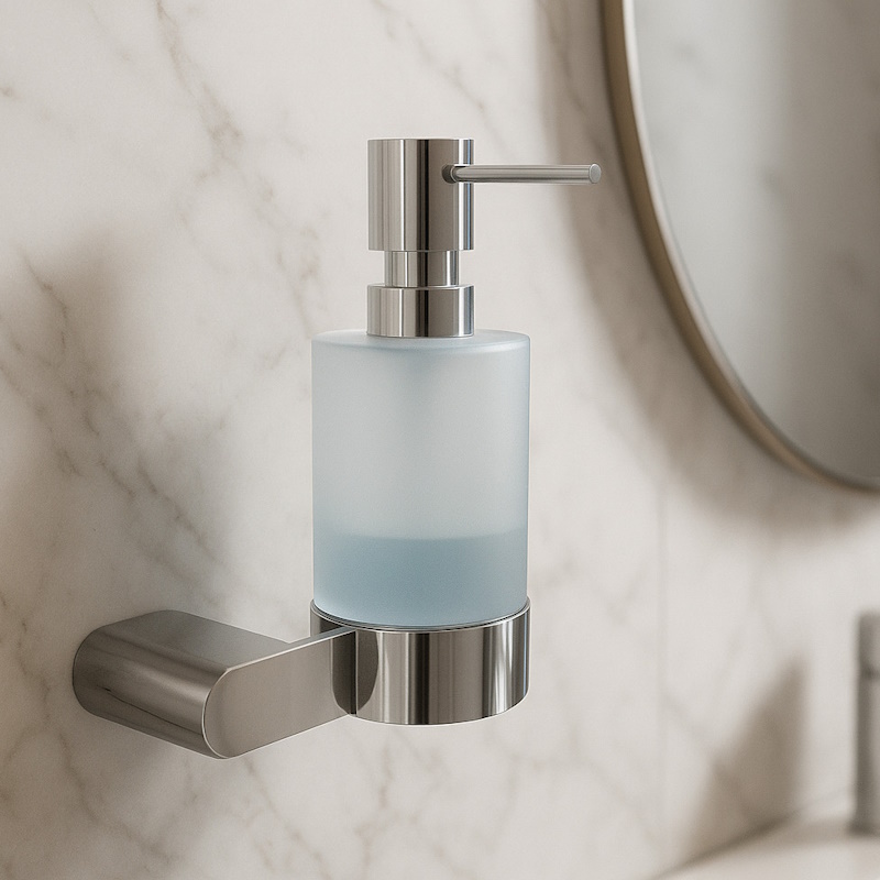 Дозатор с хромированным покрытием и матовым стеклом: механизм подачи жидкого мыла надежен и плавен, каждая порция мыла оптимальна для мытья рук, корпус из нержавеющей стали SUS 304 долговечен и прост в уходе. Объем 200мл.