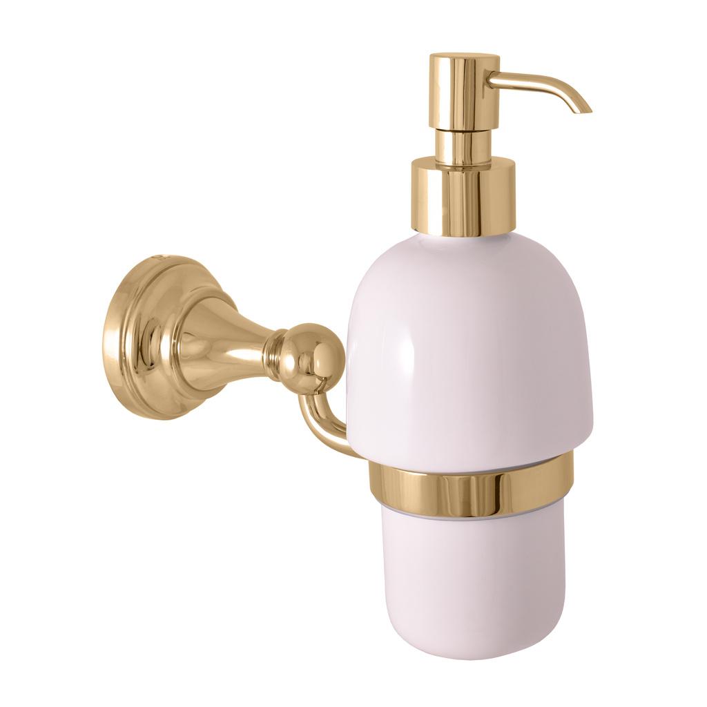 Дозатор для жидкого мыла, фаянсовый, ЦВЕТ ЗОЛОТО, арт. MKA0303Z. Стильный предмет интерьера, предназначенный для ванной комнаты. Устанавливается на стену. Материал, применяемый для производства аксессуара - латунь/фаянс. Практичная и в то же время продуманная вещь, выполненная в стиле ретро. Кроме аксессуаров в коллекции MORAVA присутствуют смесители для раковины, ванны, душа, кухни. Это позволит оформить ванную комнату в едином стиле!