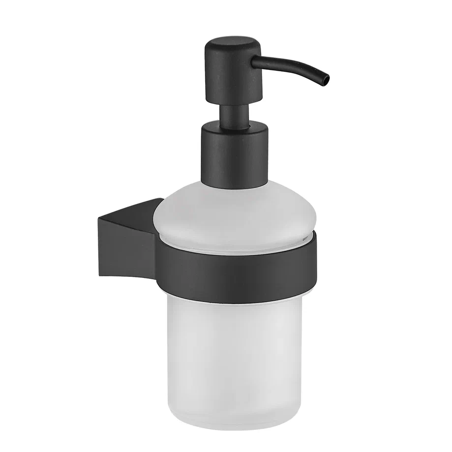 Дозатор для жидкого мыла Shevanik SG5744H в черном матовом цвете — это стильное и функциональное решение для вашей ванной комнаты. Элегантная конструкция сочетает в себе прочный держатель из нержавеющей стали и изящный дозатор из матового стекла, что придаёт изделию современный и изысканный вид. Объём дозатора составляет 200 мл, что обеспечивает достаточное количество мыла для повседневного использования, при этом не занимая много места. Современный минималистичный дизайн делает этот аксессуар универсальным элементом интерьера, который гармонично впишется в любой стиль. Настенный монтаж обеспечивает простоту установки, а комплект, включающий как саморезы, так и дюбели, позволяет выбрать оптимальный способ крепления в зависимости от типа стены. Дозатор Shevanik не только практичен в использовании, но и служит стильным акцентом в оформлении помещения, подчёркивая ваш безупречный вкус.