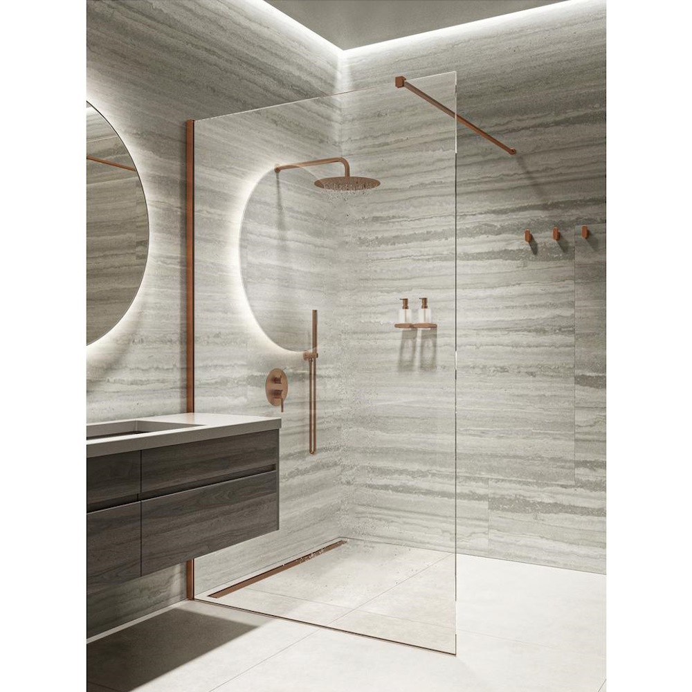 Простота, стиль и практичность в каждой детали. Walk-Inдлиной 120 см с бронзовым профилем и прозрачным стеклом 8 мм создаёт ощущение открытой и просторной душевой зоны. Smart Clean облегчает уход, а надёжный профиль гарантирует долговечность.