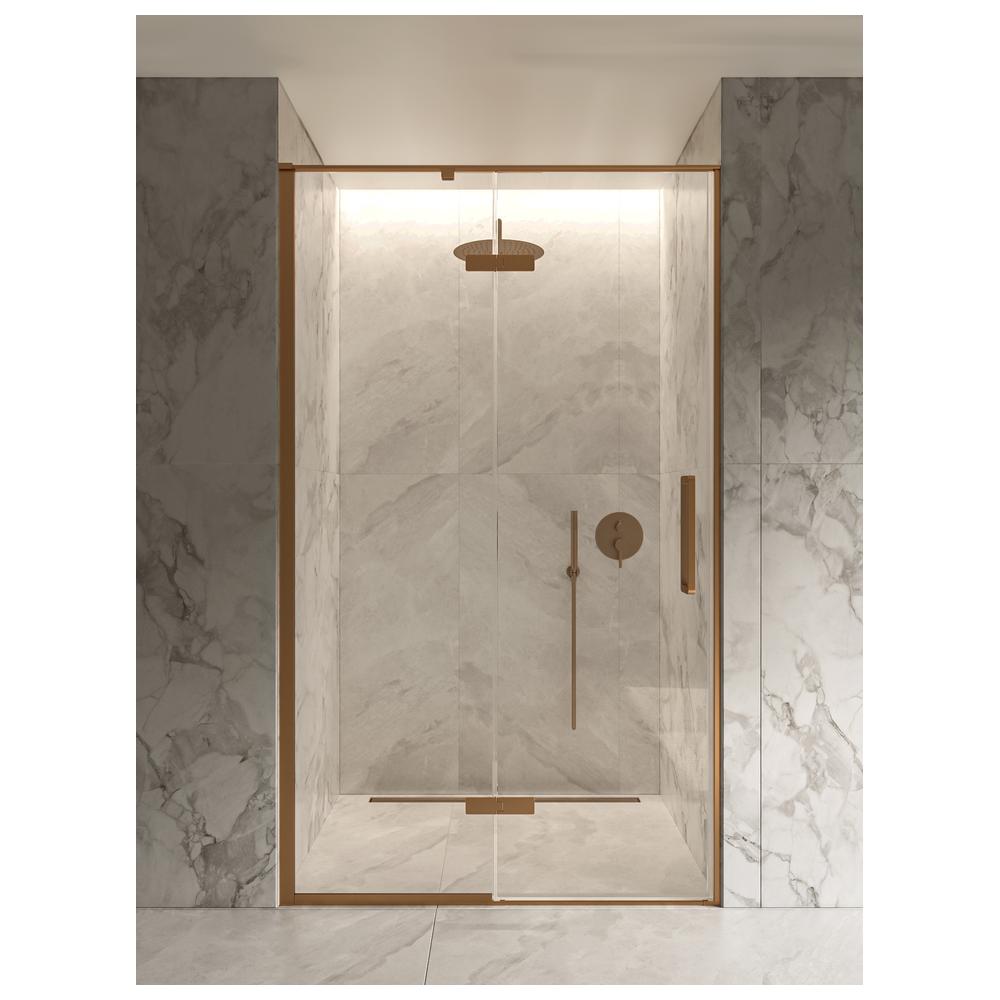 Просторная дверь для ниш шириной 120 см с бронзовым профилем и прозрачным стеклом 8 мм. Элегантный акцент для современной ванной комнаты. Покрытие Smart Clean — легкий уход. Матовый алюминиевый профиль — долговечность. Полный комплект для монтажа.