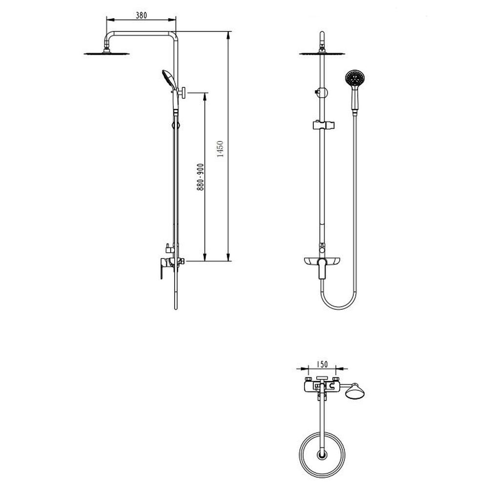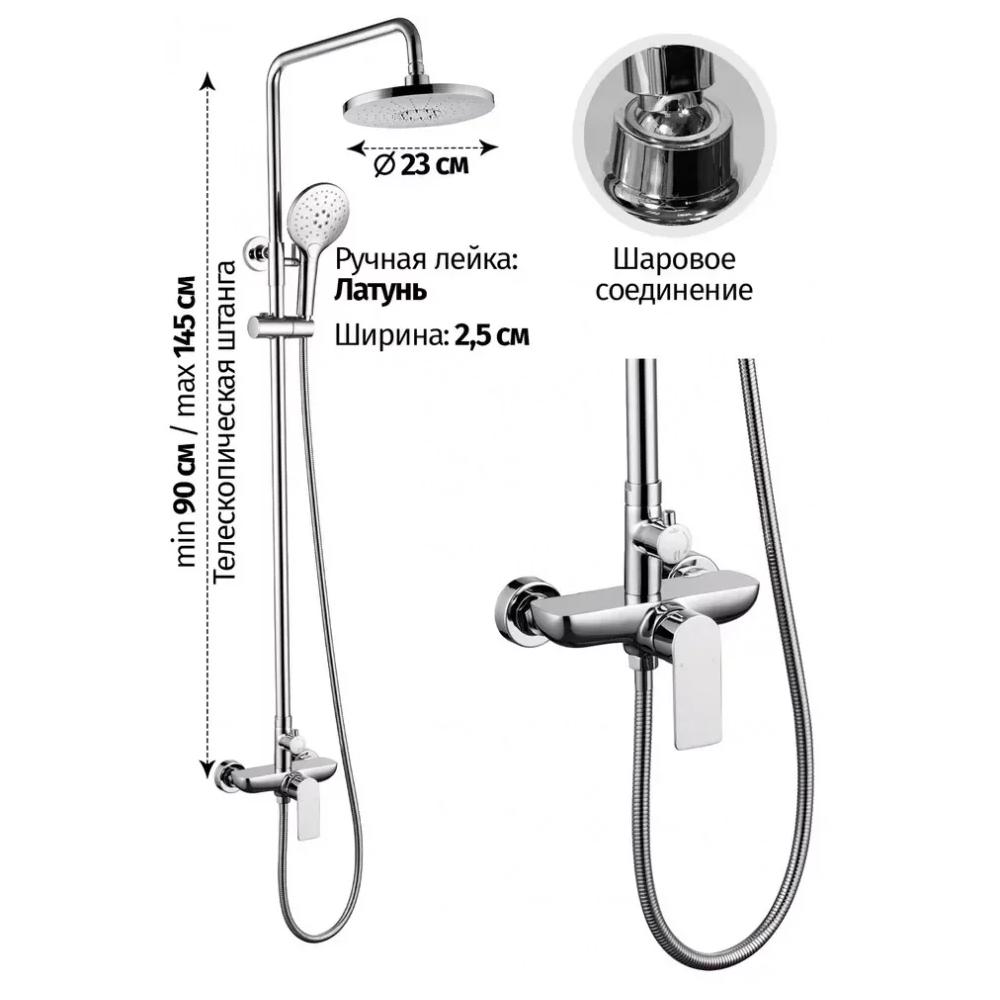 верхний душ, душевая штанга с держателем лейки, ручной душ, смеситель, шланг, эксцентрики, декоративные отражатели