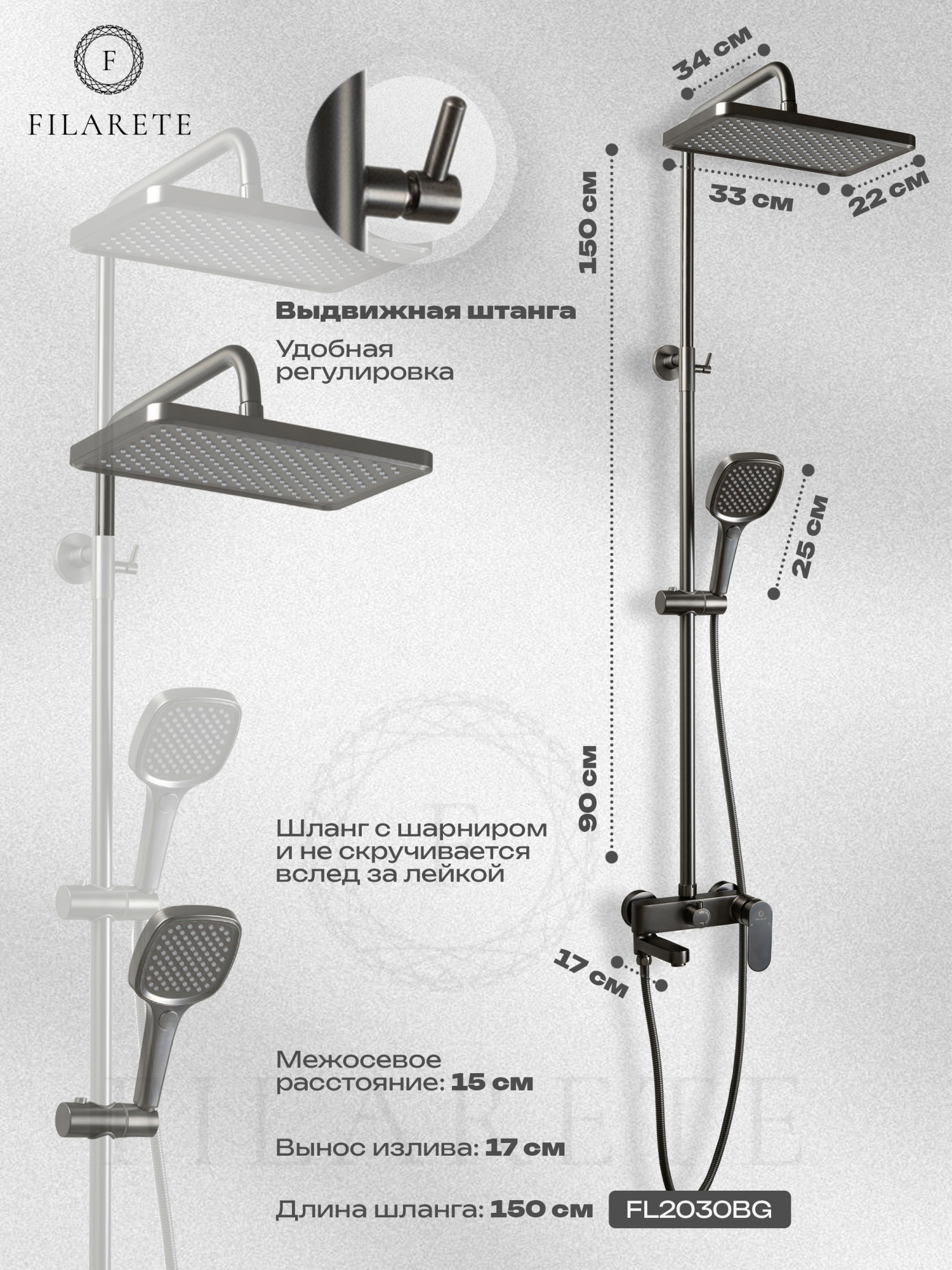 верхний душ, душевая штанга с держателем лейки, ручной душ, смеситель, шланг, эксцентрики, декоративные отражатели