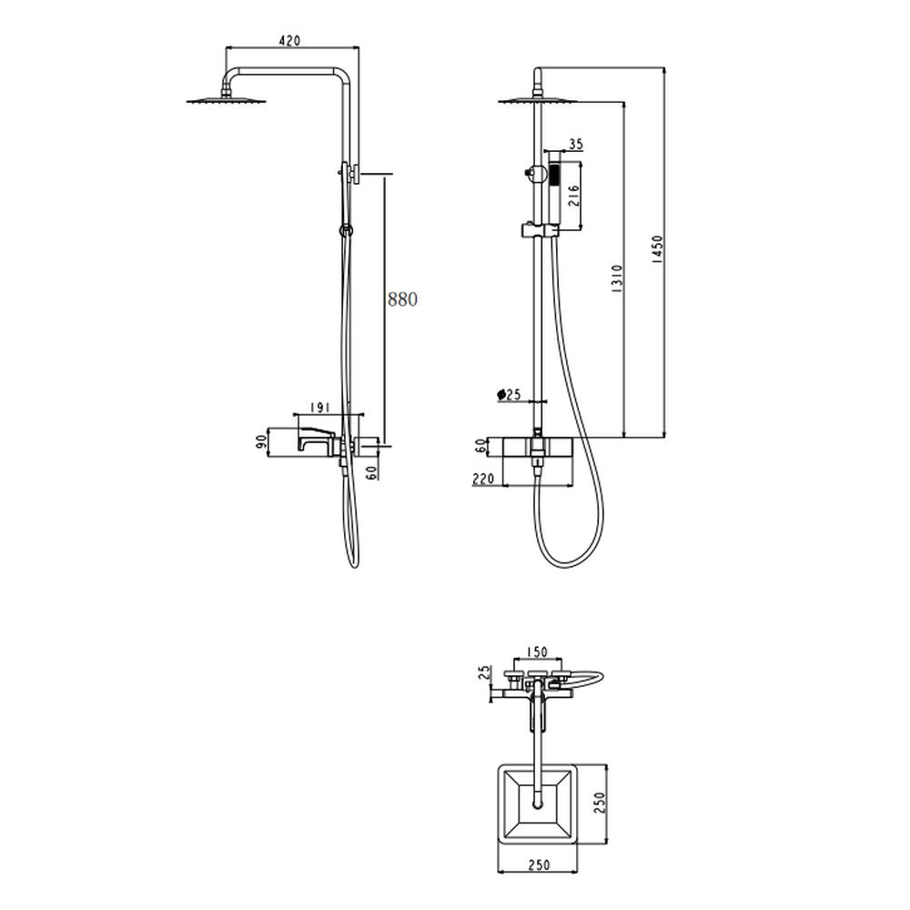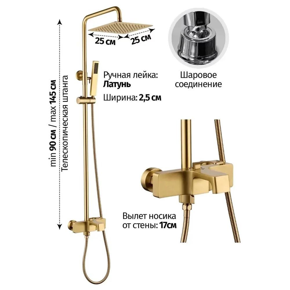 верхний душ, душевая штанга с держателем лейки, ручной душ, смеситель, шланг, эксцентрики, декоративные отражатели