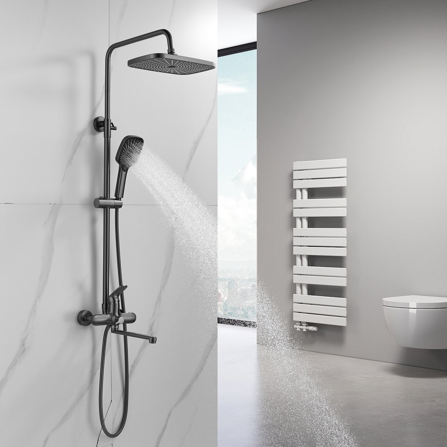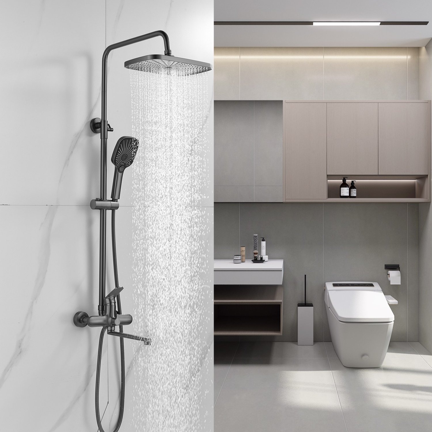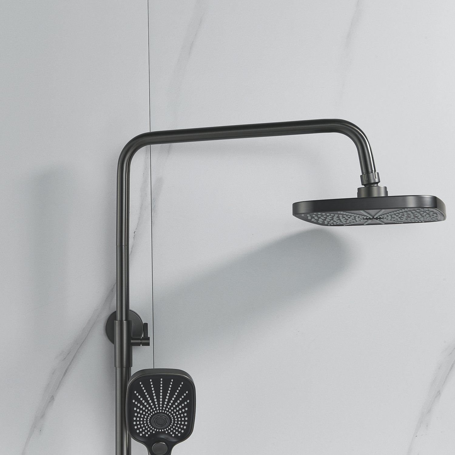 Ручной душ с 3 режимами работы также изготовлен из качественного ABS-пластика, регулируется по высоте и наклону для оптимального комфорта использования.