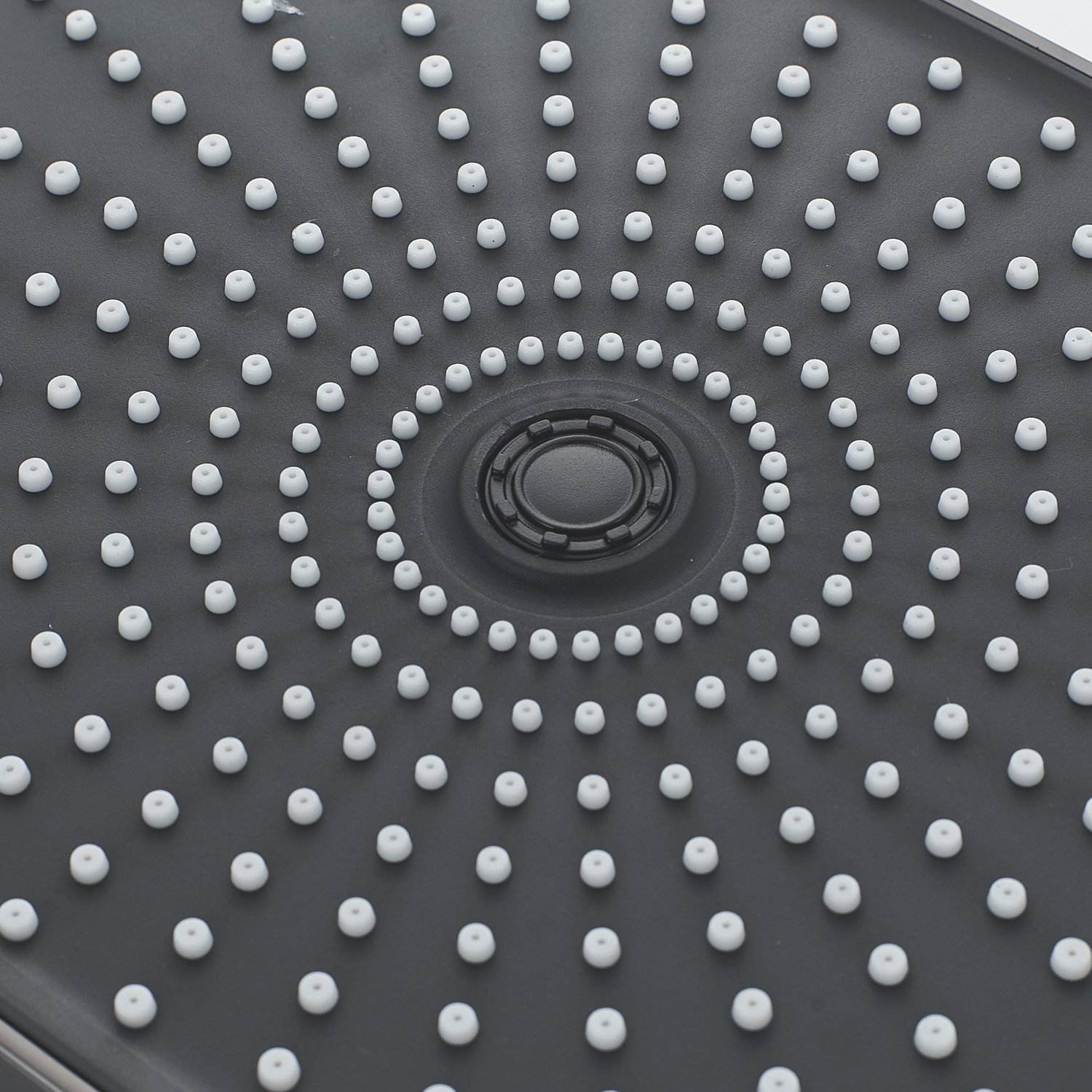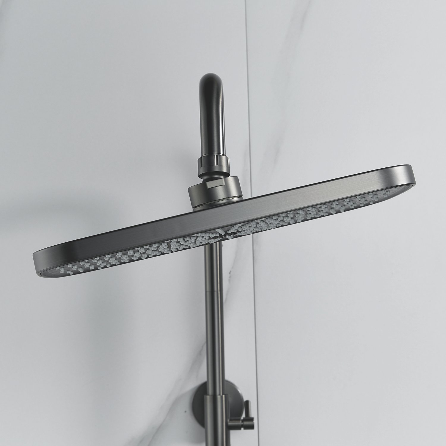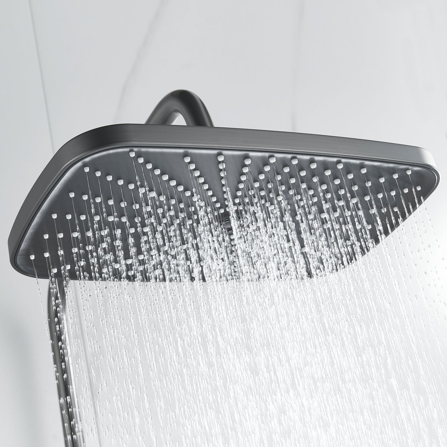 Верхний душ размером 300x190 мм из ABS-пластика регулируется по высоте благодаря телескопической штанге и по наклону с помощью встроенного шарнира, что обеспечивает максимальный комфорт и удобство использования. Самоочищающиеся силиконовые форсунки предотвращают образование известкового налета и сохраняют чистоту и силу потока воды.