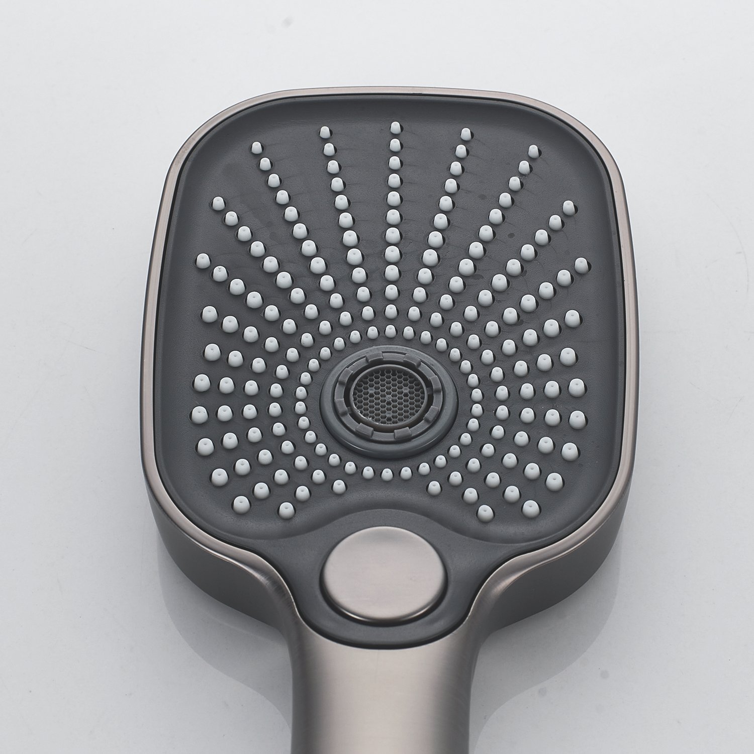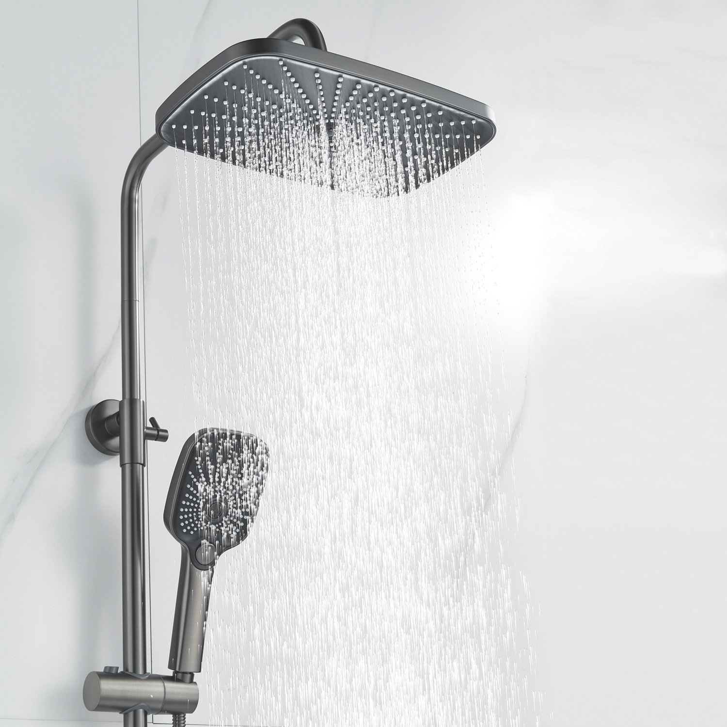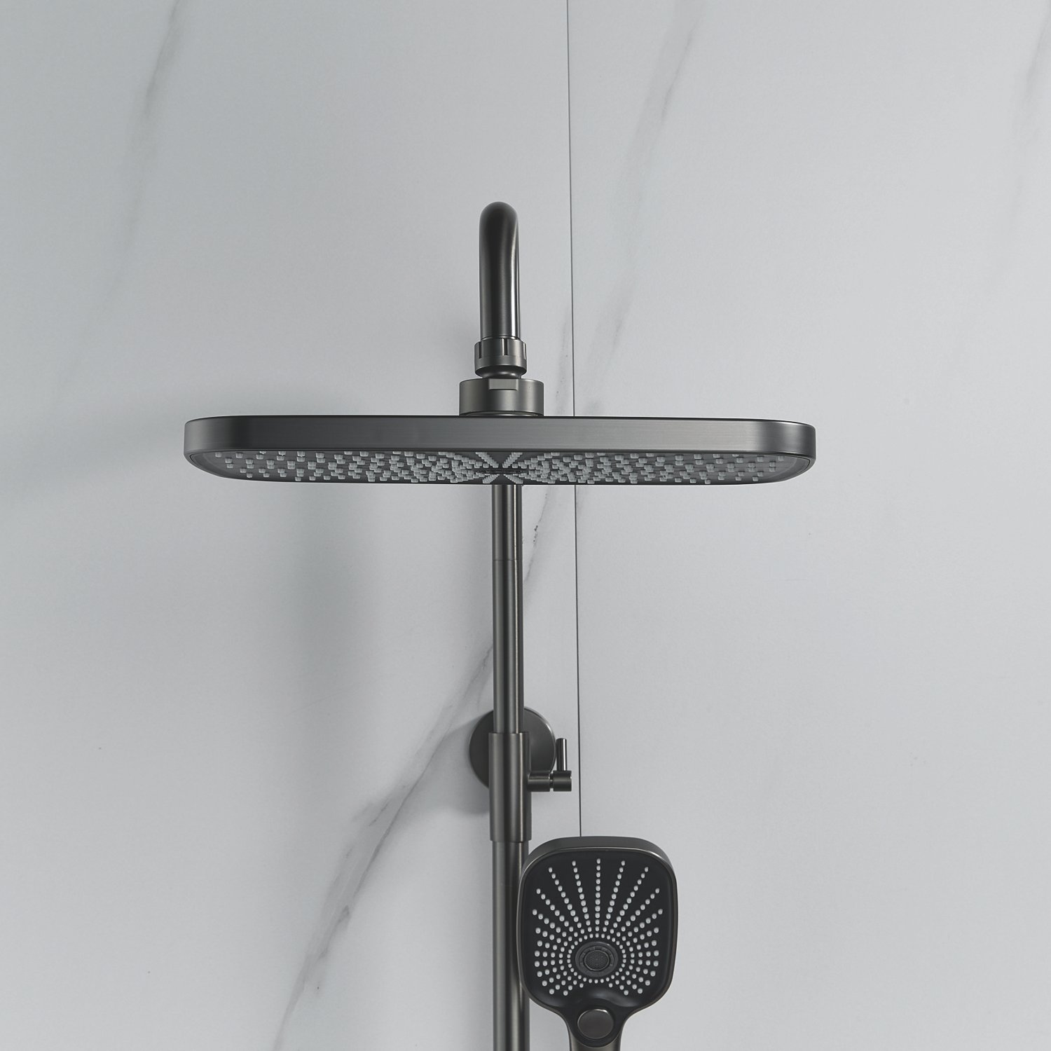 Верхний душ размером 300x190 мм из ABS-пластика регулируется по высоте благодаря телескопической штанге и по наклону с помощью встроенного шарнира, что обеспечивает максимальный комфорт и удобство использования. Самоочищающиеся силиконовые форсунки предотвращают образование известкового налета и сохраняют чистоту и силу потока воды.