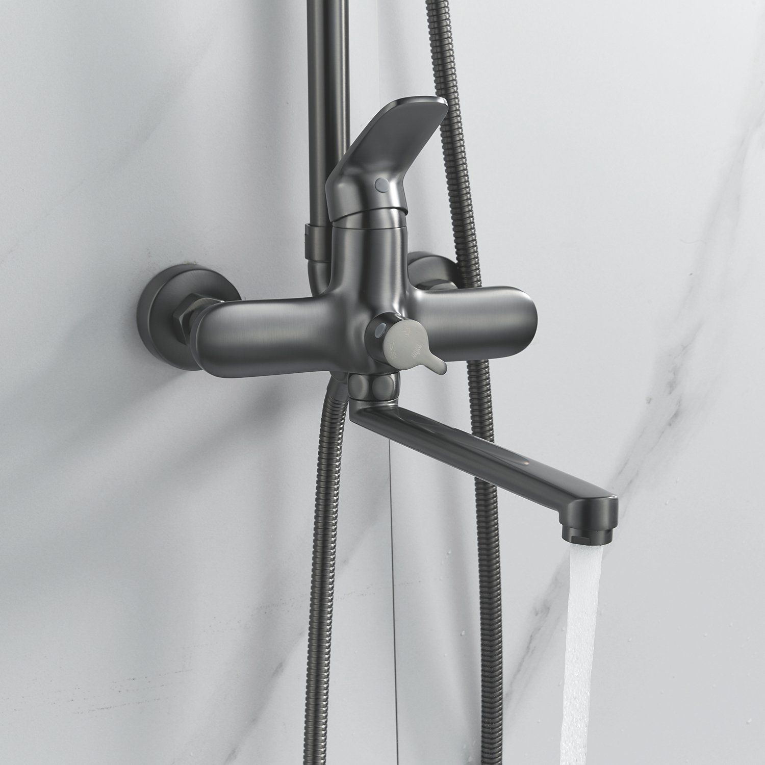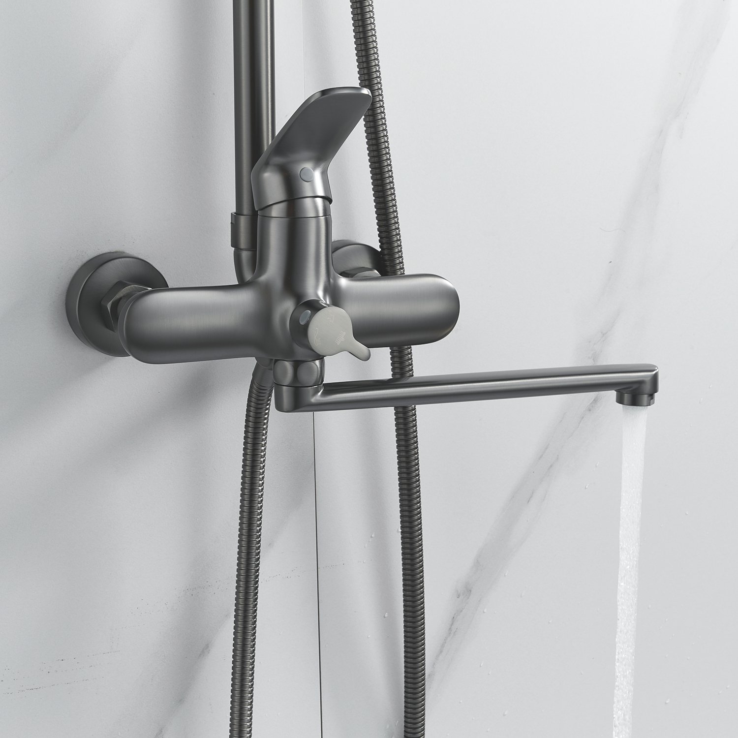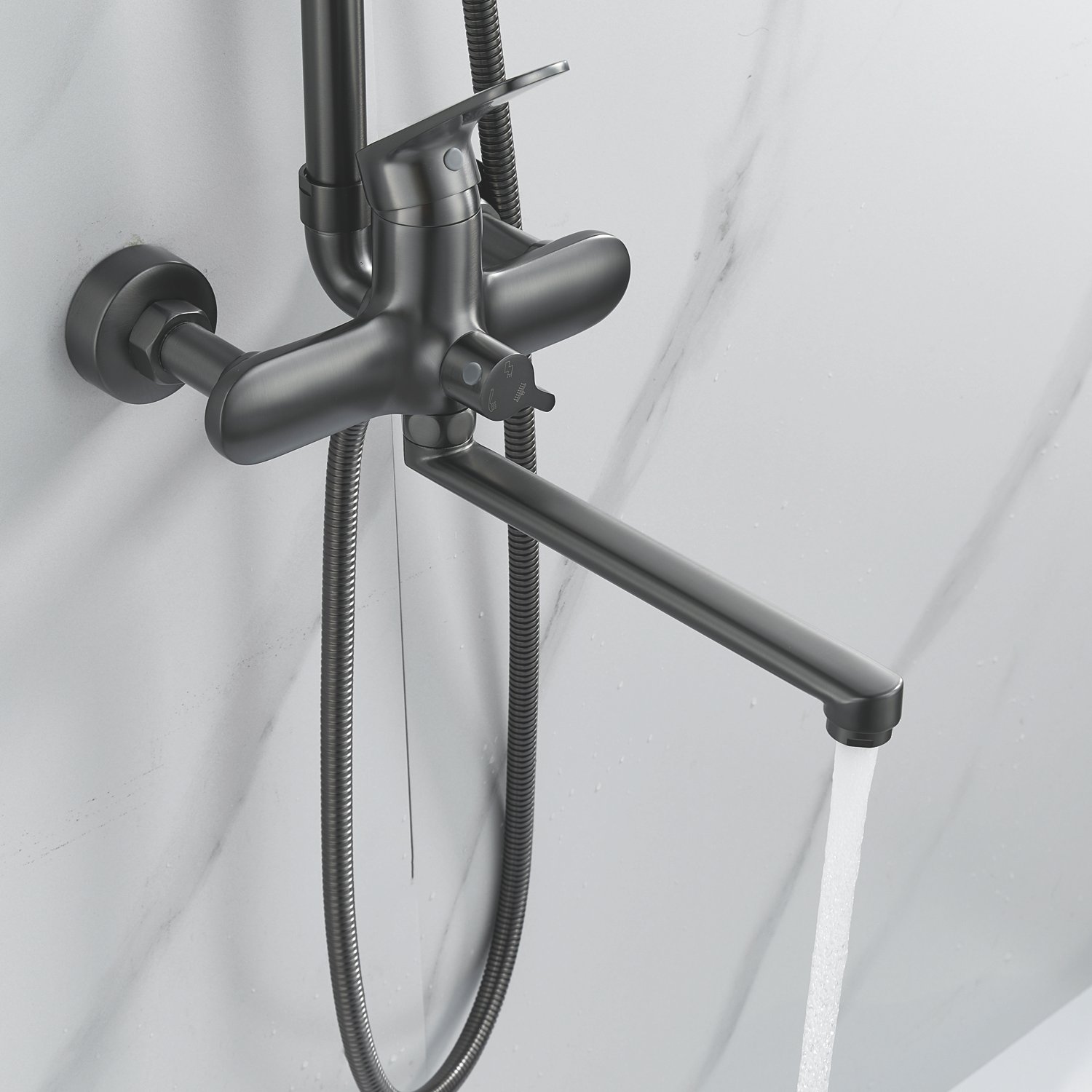 Система оснащена длинным поворотным изливом, который идеально подходит для удобного наполнения ванны и позволяет использовать душ в качестве смесителя для других нужд.