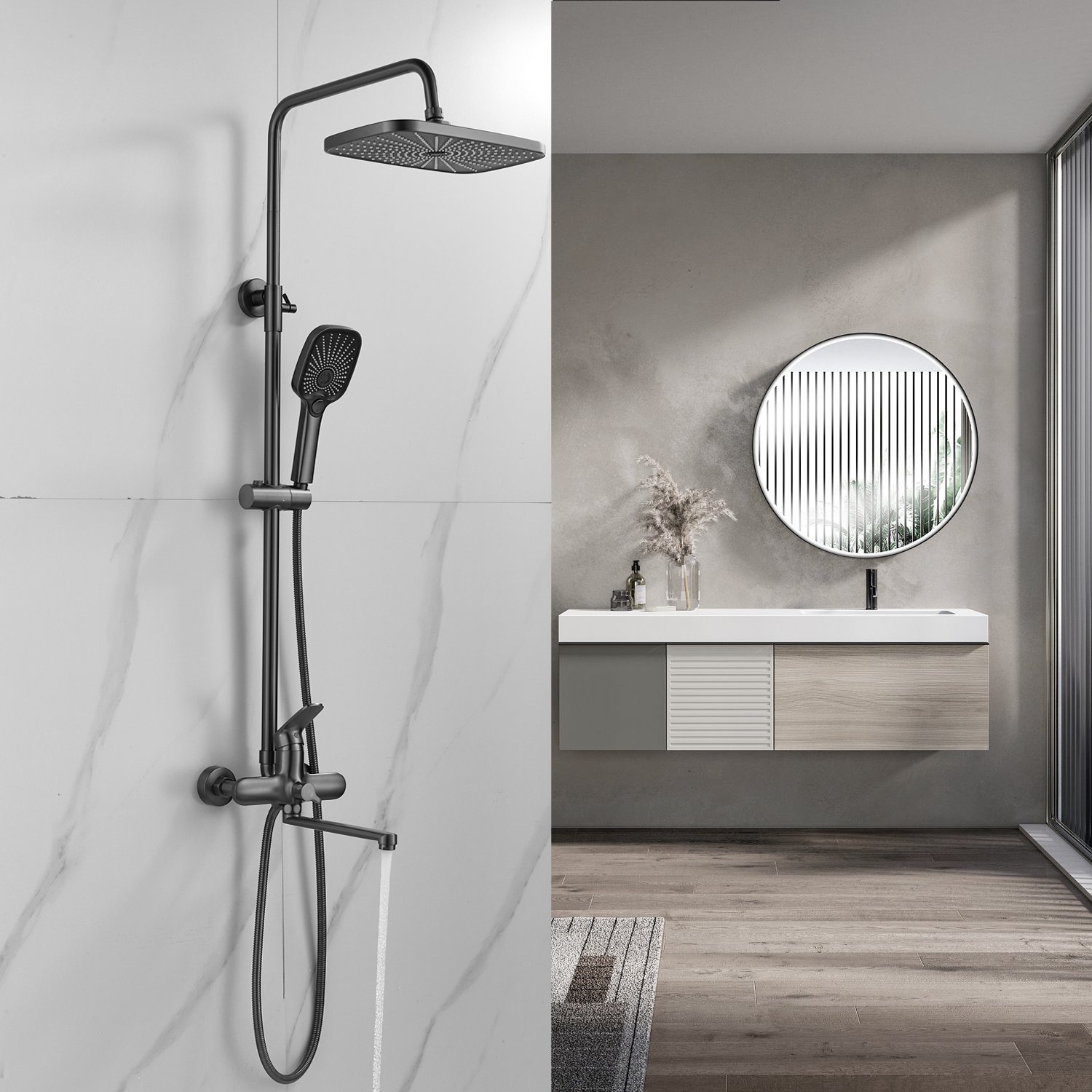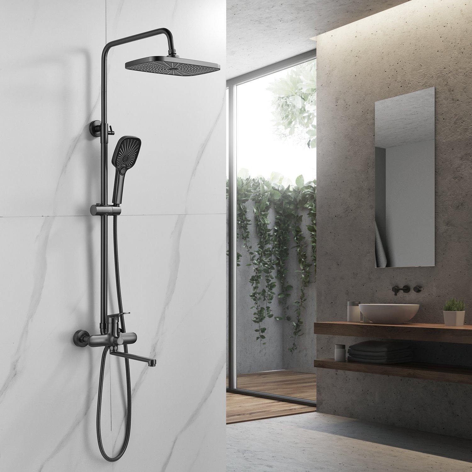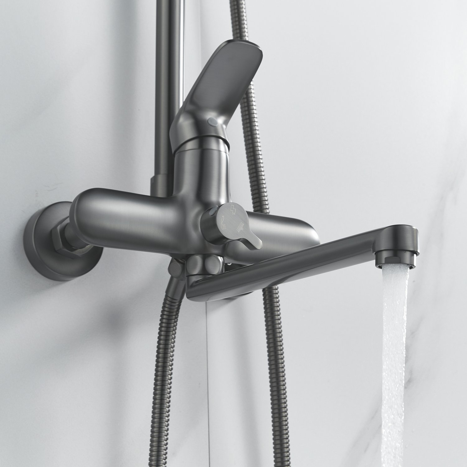 Система оснащена длинным поворотным изливом, который идеально подходит для удобного наполнения ванны и позволяет использовать душ в качестве смесителя для других нужд.