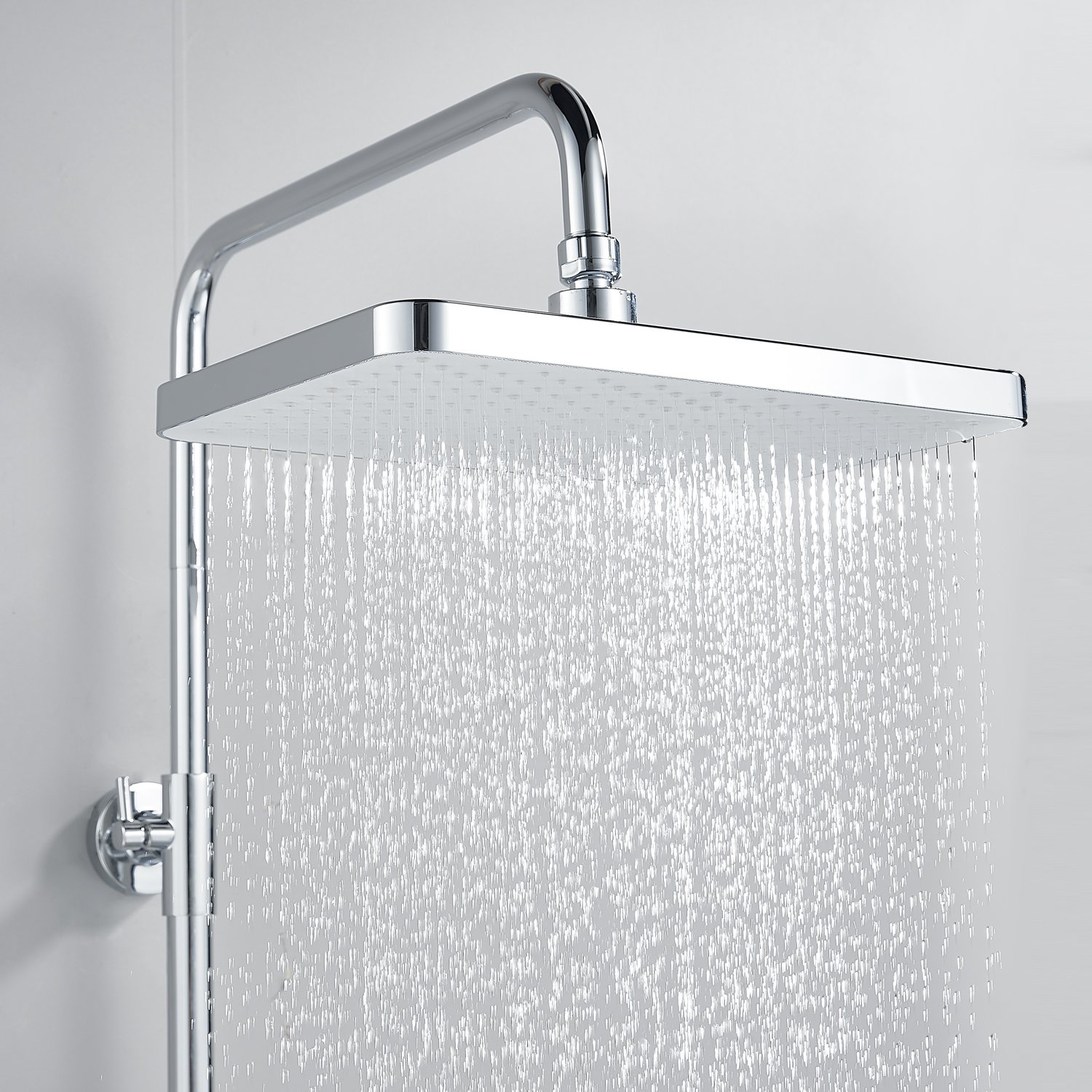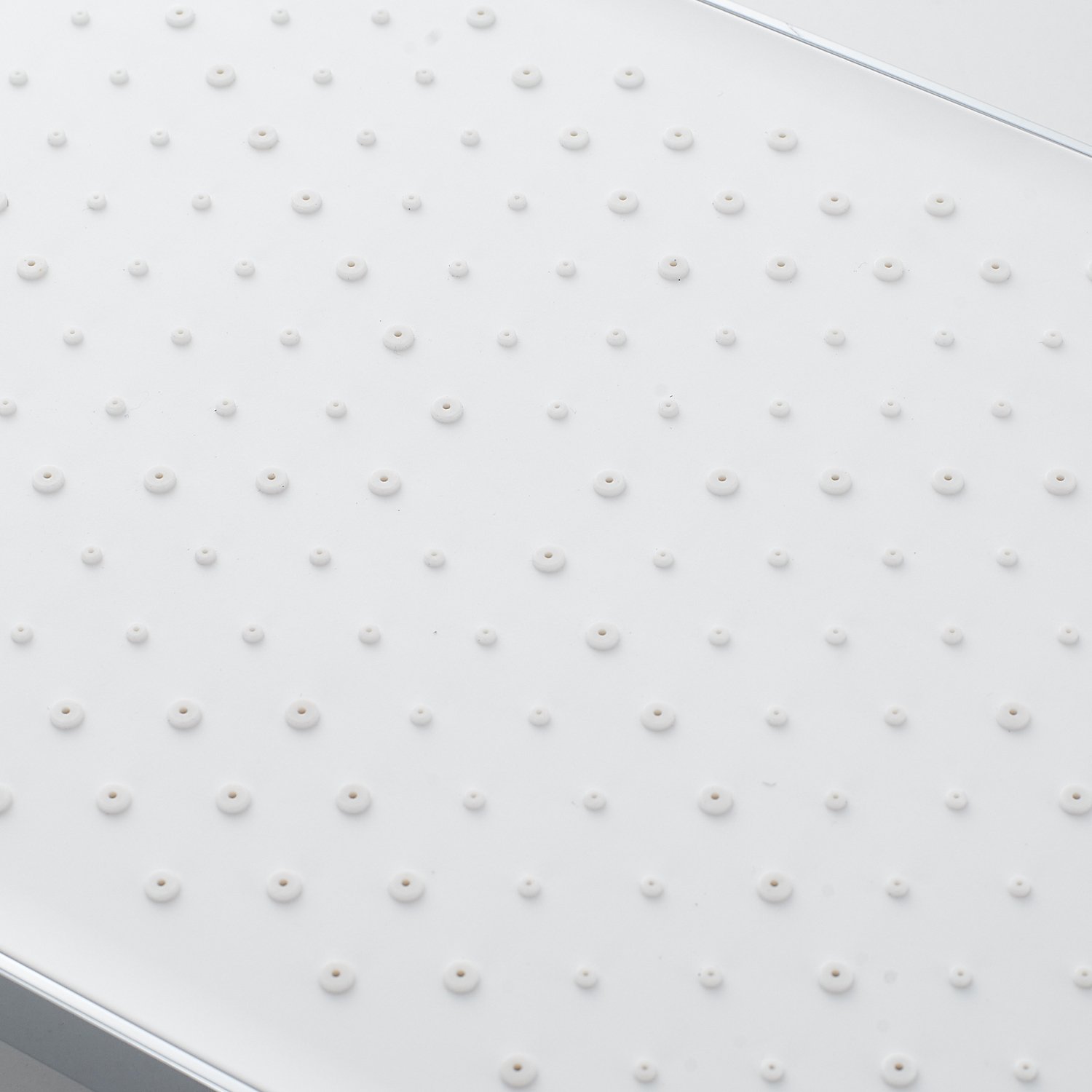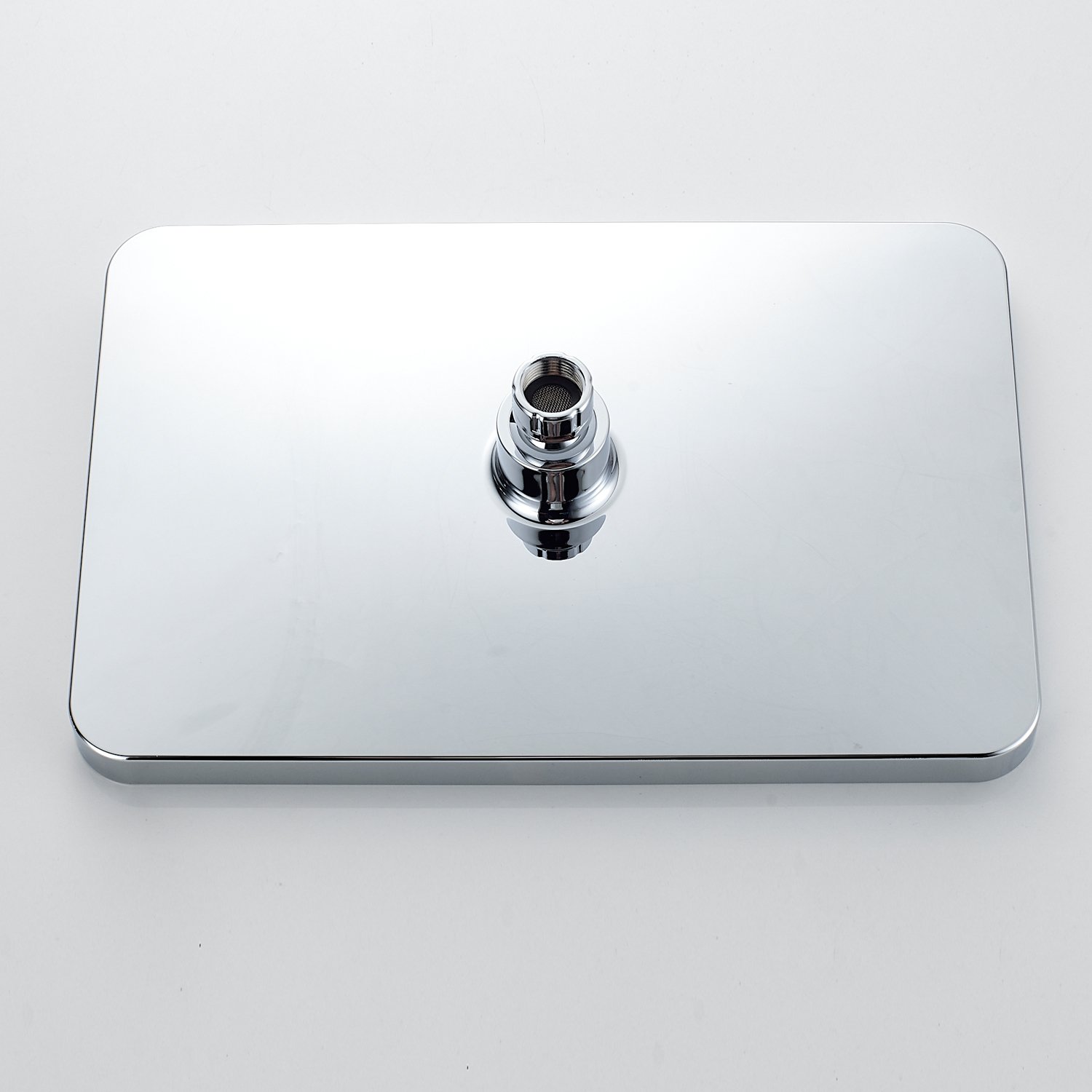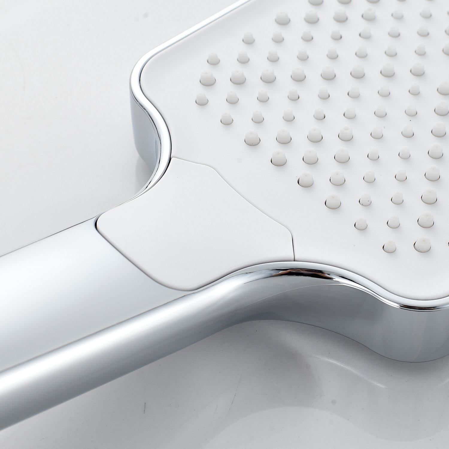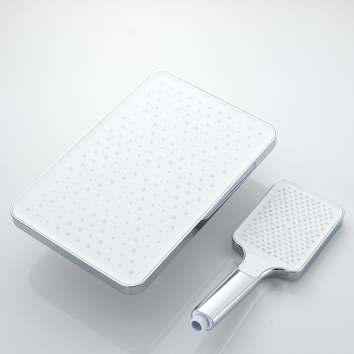 Верхний душ размером 320x210 мм из ABS-пластика легко регулируется по наклону благодаря встроенному шарниру. Он также оснащен самоочищающимися силиконовыми форсунками, которые защищают его от известкового налета, обеспечивая всегда чистый и сильный поток воды.