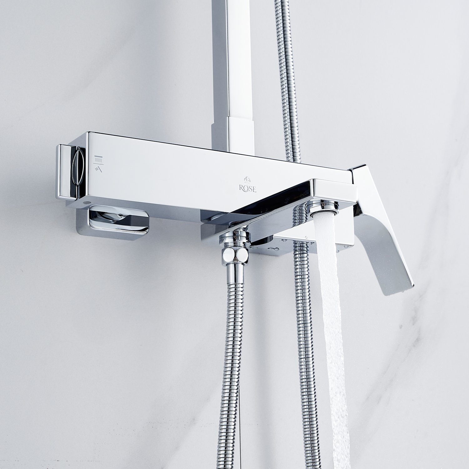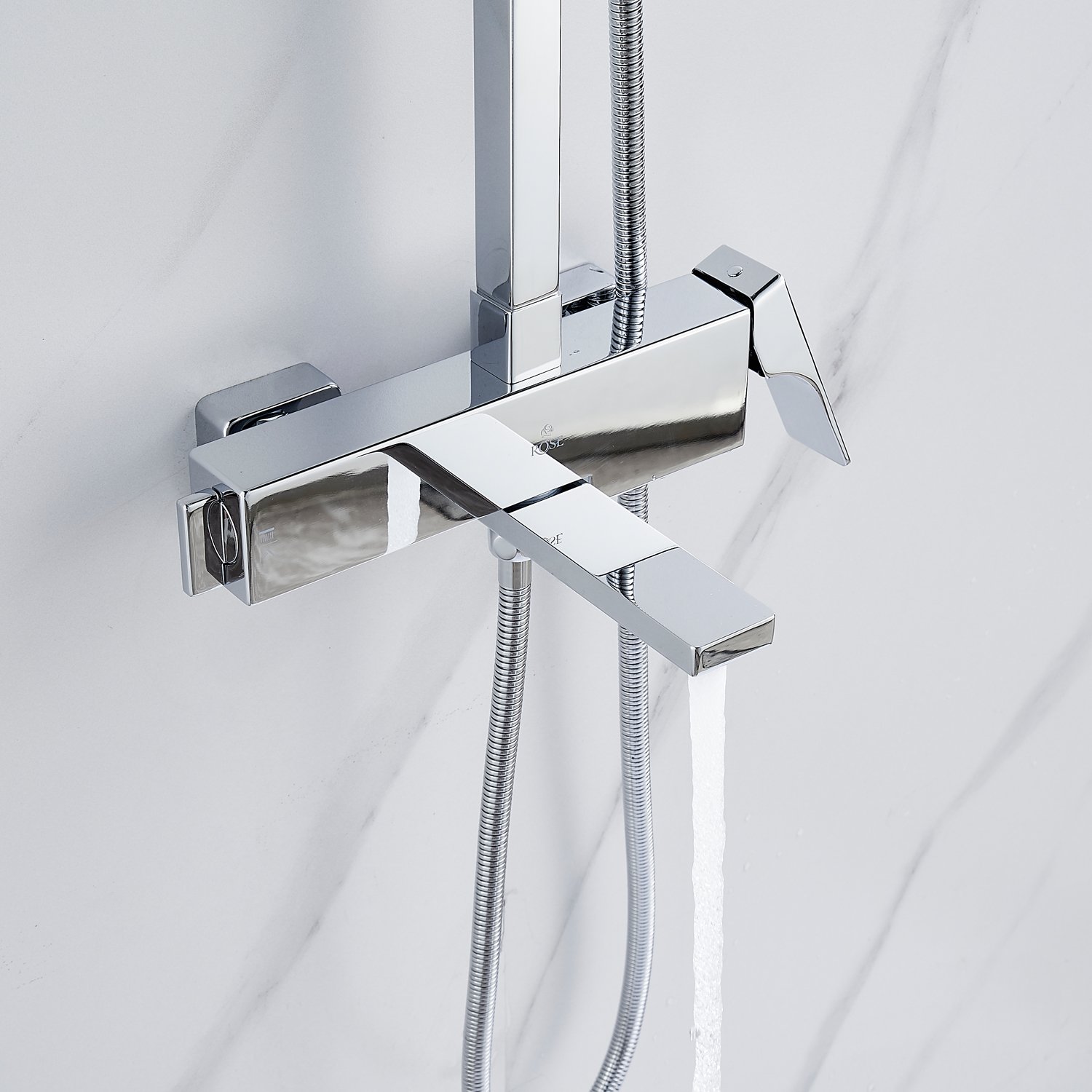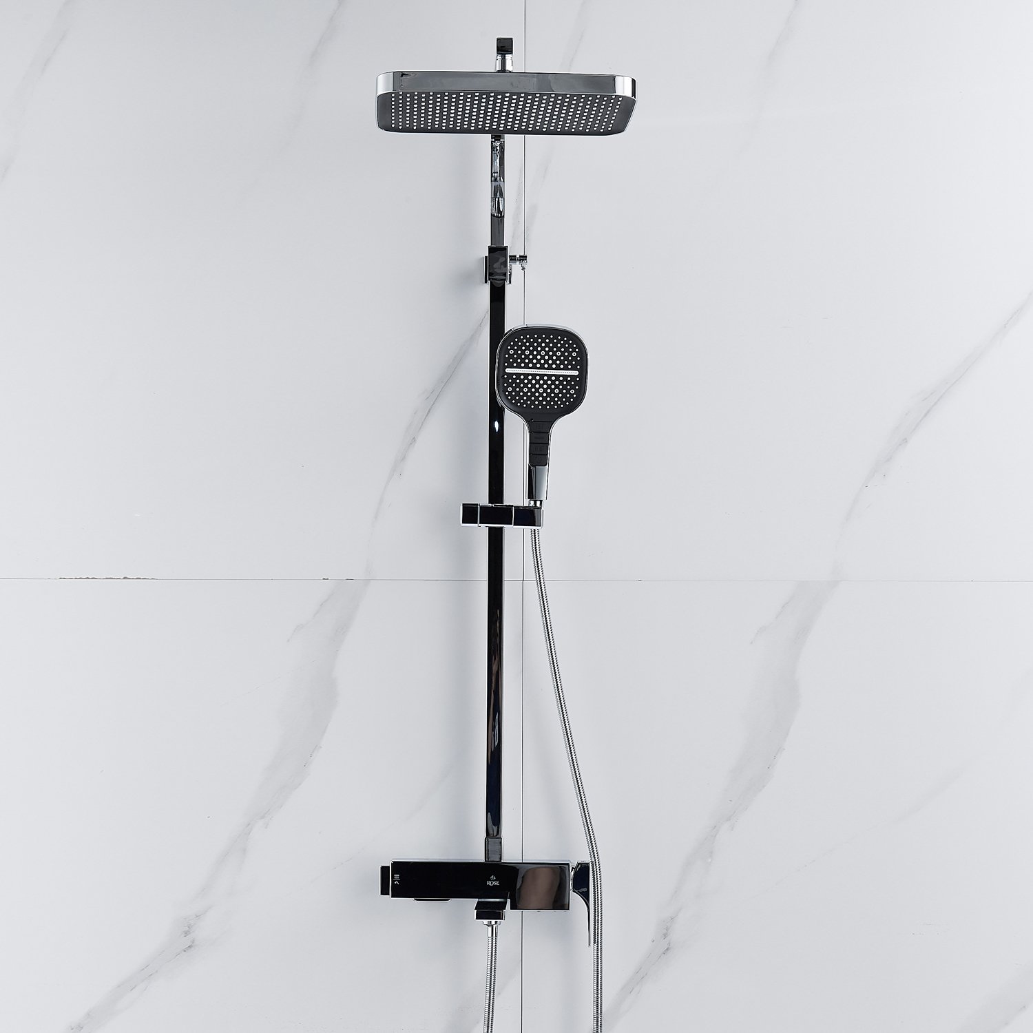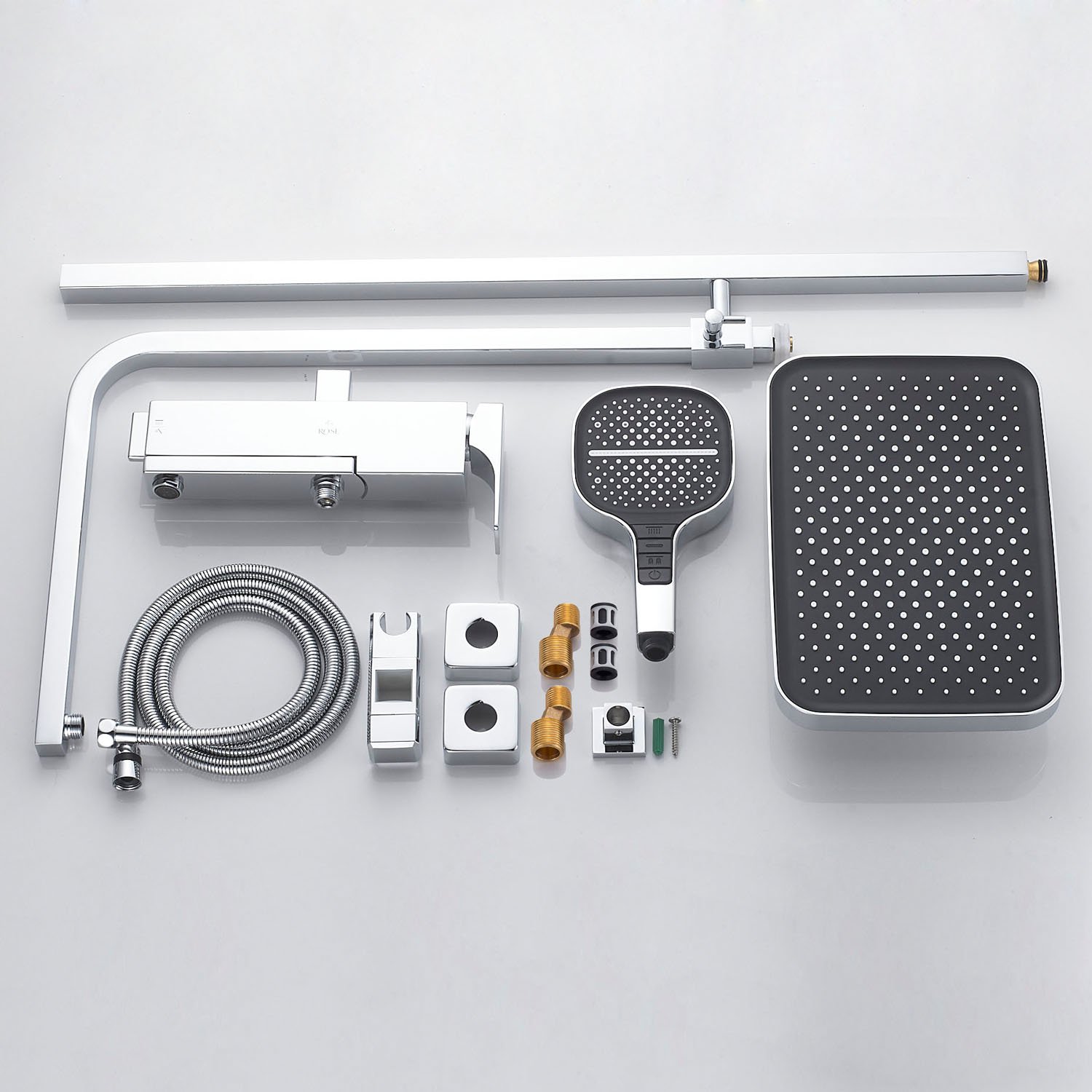 смеситель, верхний душ, штанга с держателем душевой лейки, душевая лейка, шланг, эксцентрики