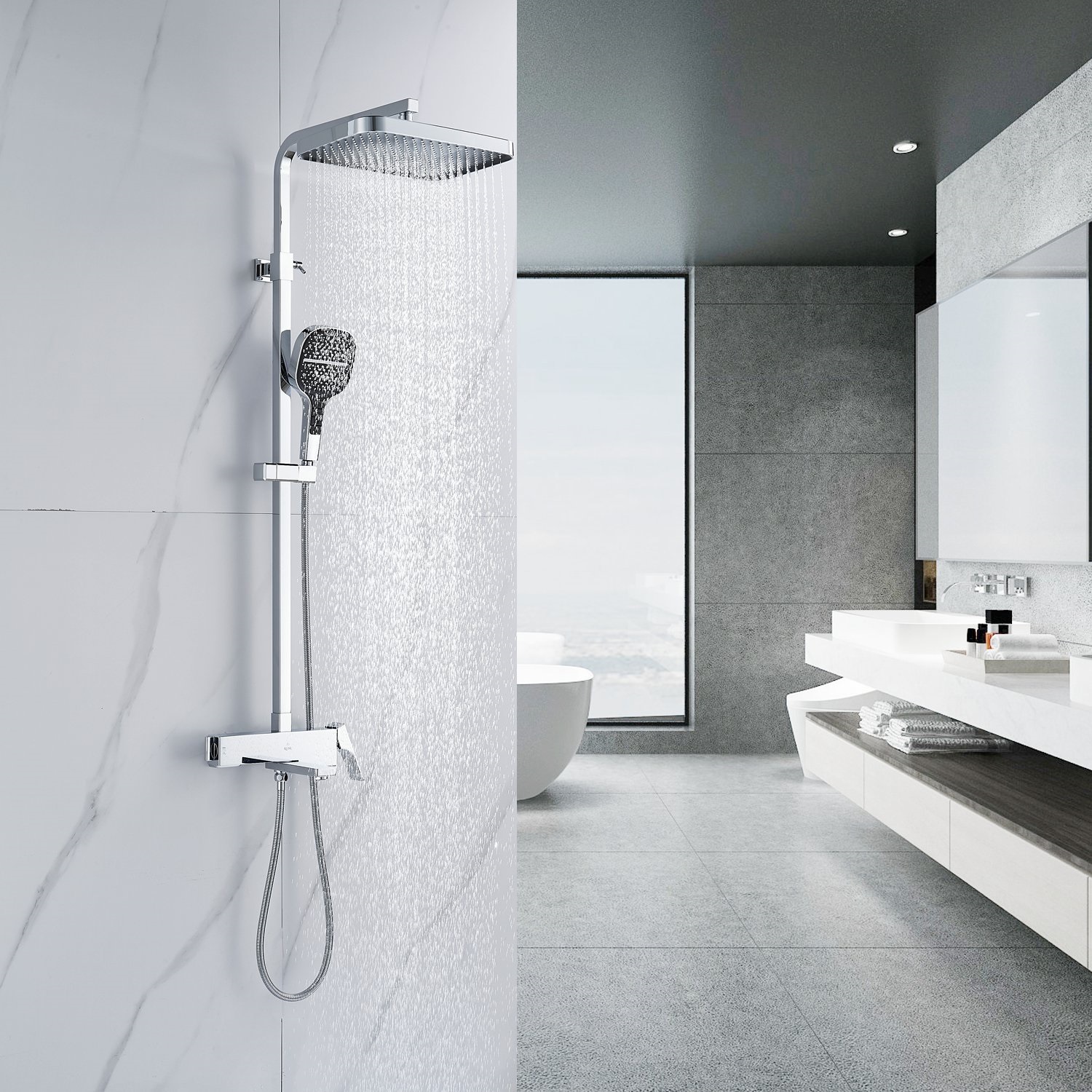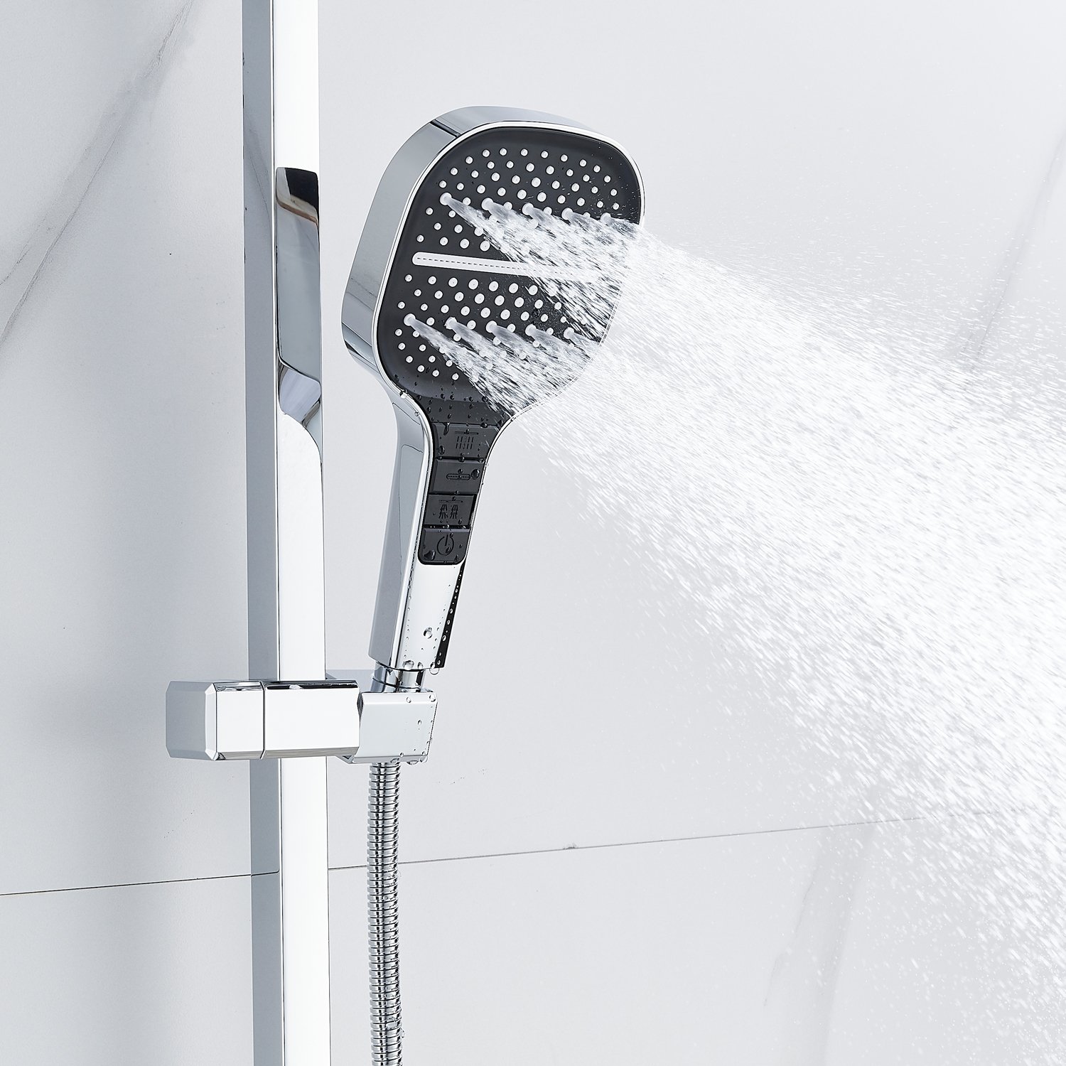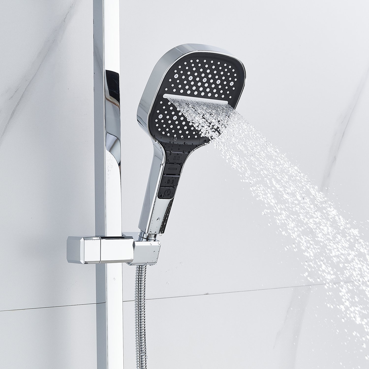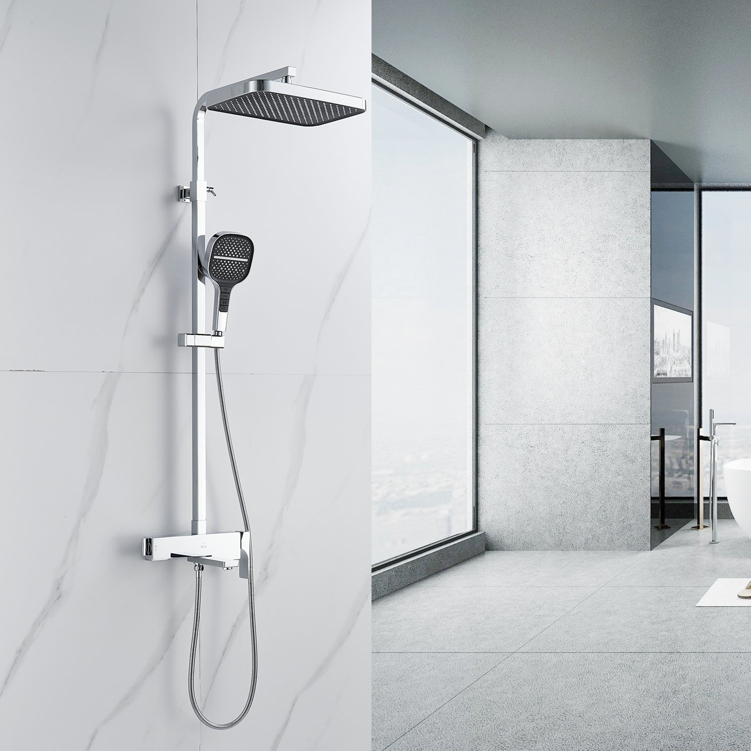 смеситель, верхний душ, штанга с держателем душевой лейки, душевая лейка, шланг, эксцентрики