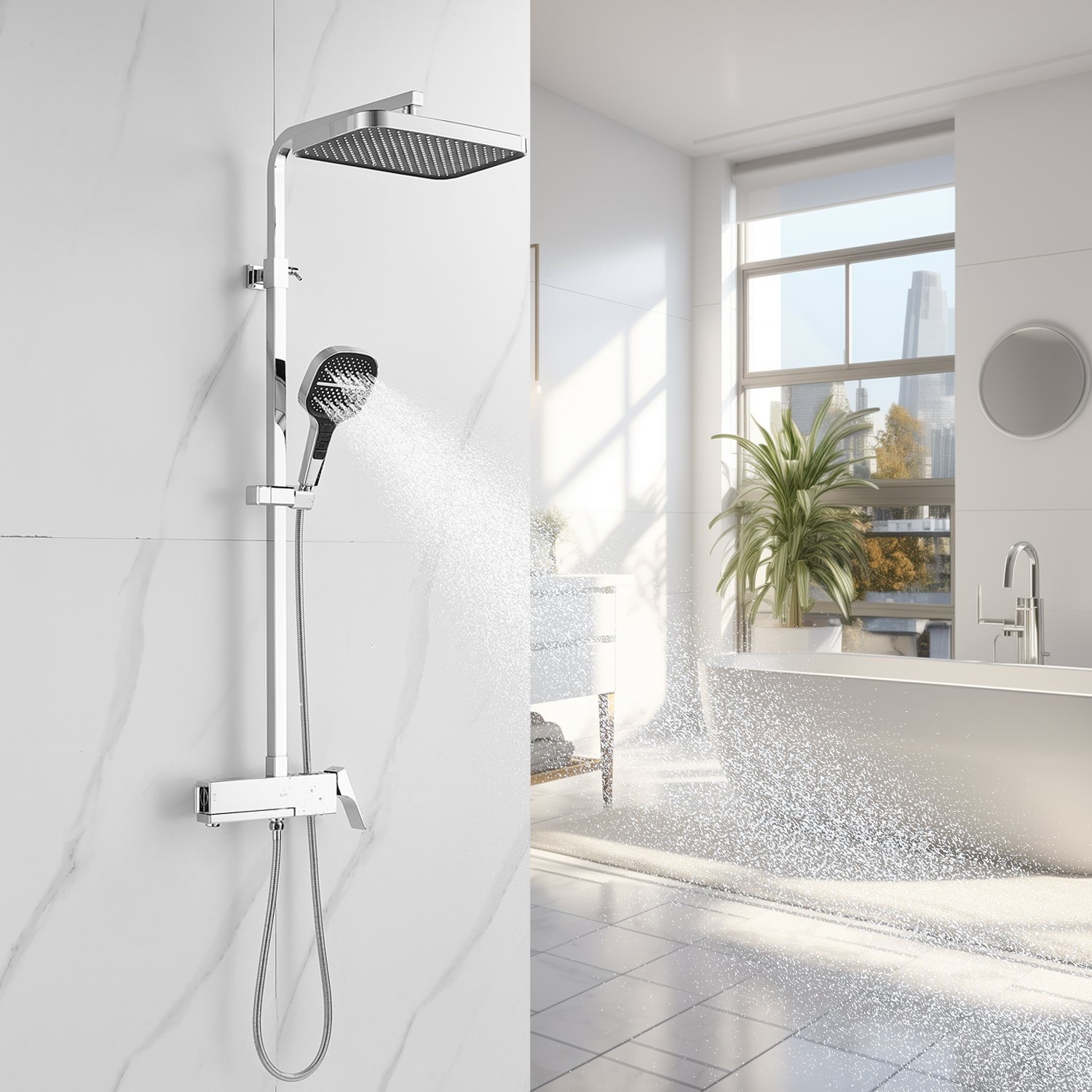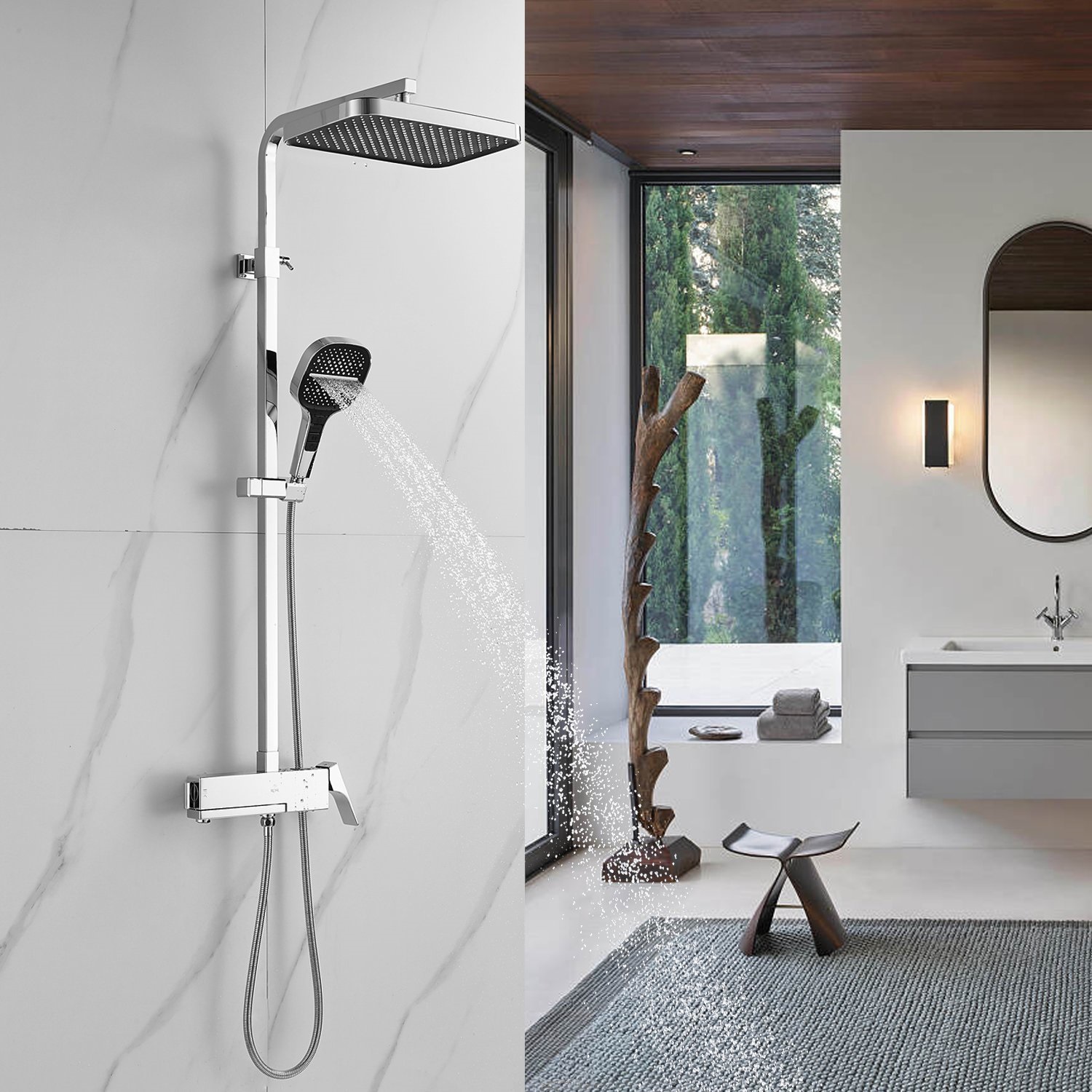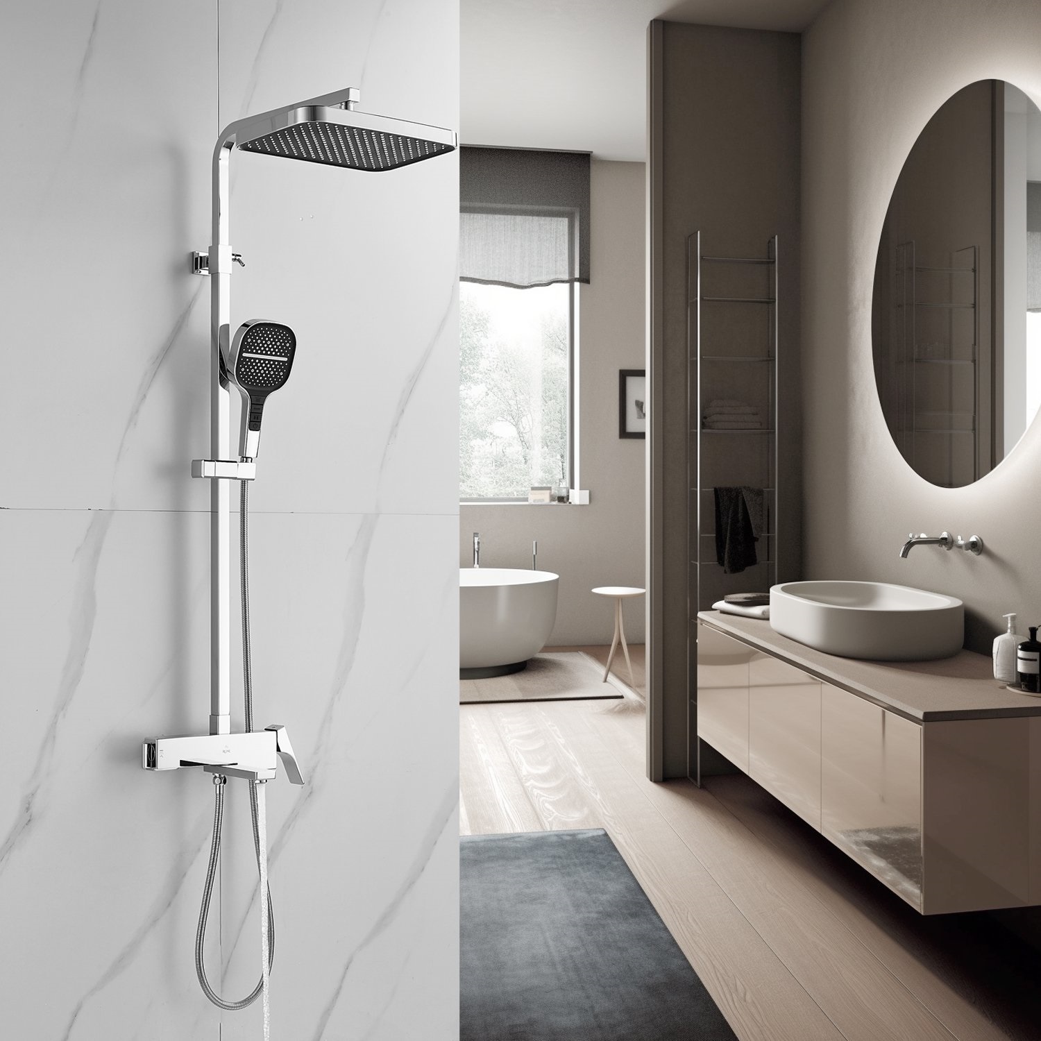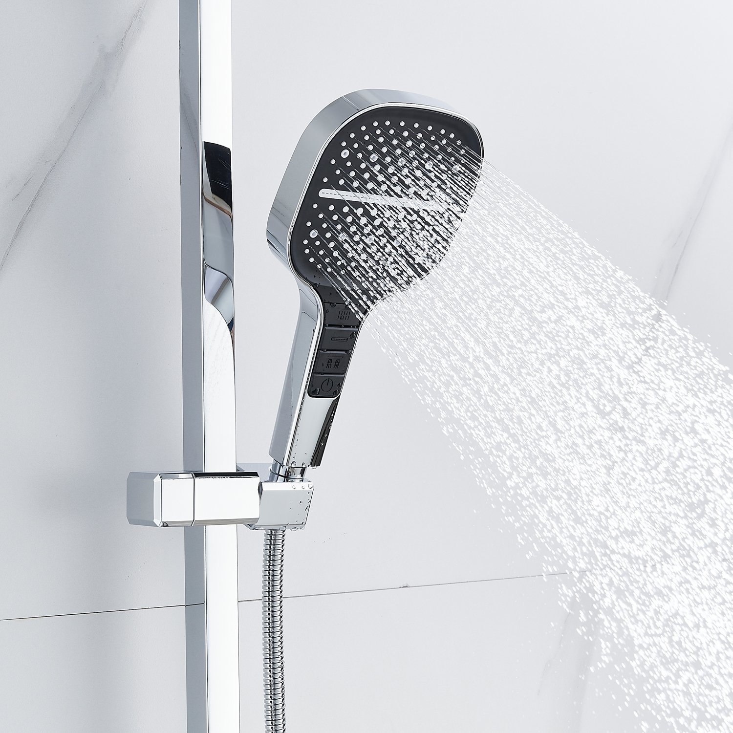 смеситель, верхний душ, штанга с держателем душевой лейки, душевая лейка, шланг, эксцентрики