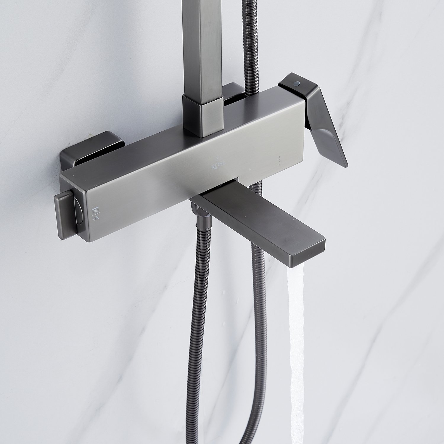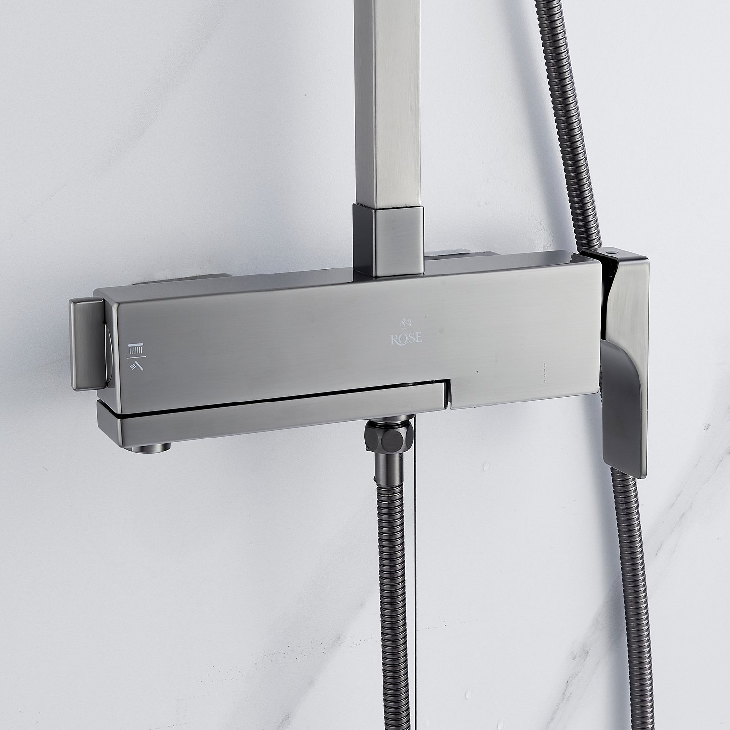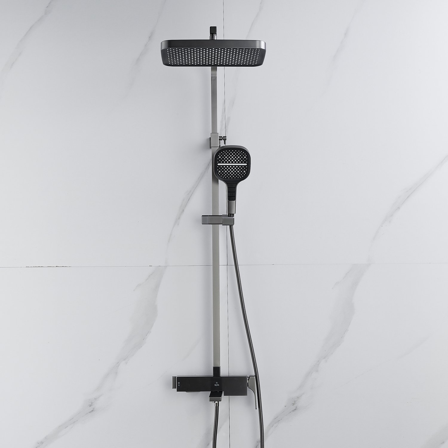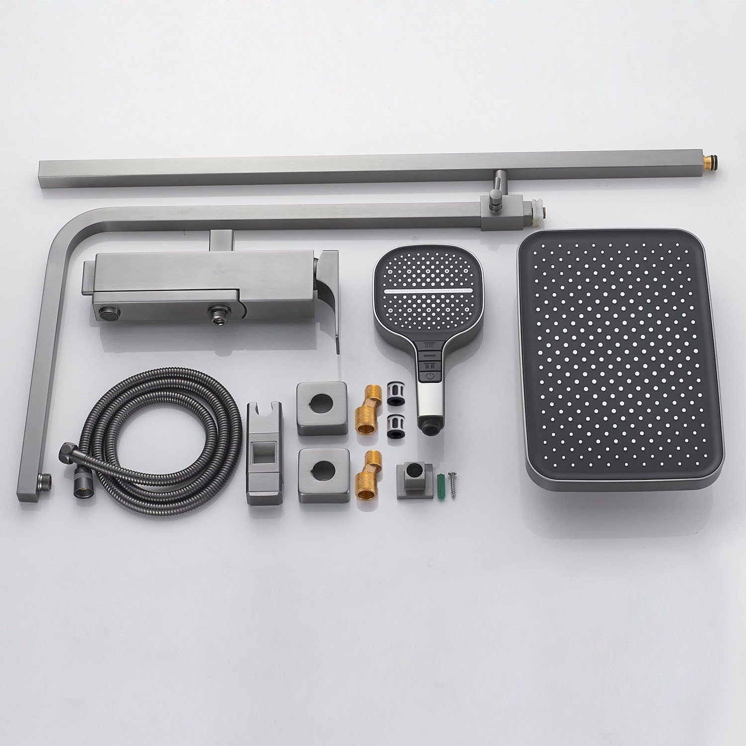 смеситель, верхний душ, штанга с держателем душевой лейки, душевая лейка, шланг, эксцентрики