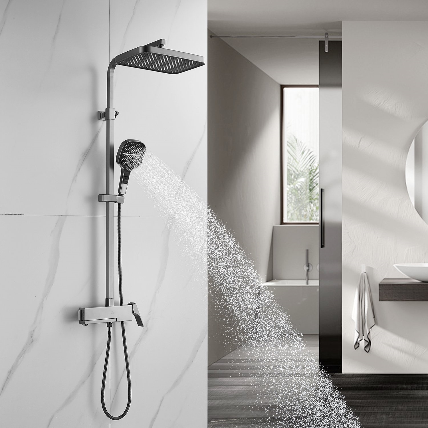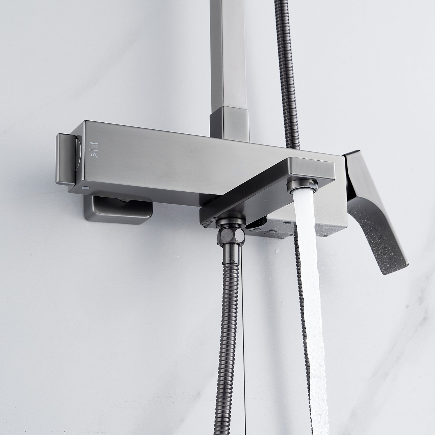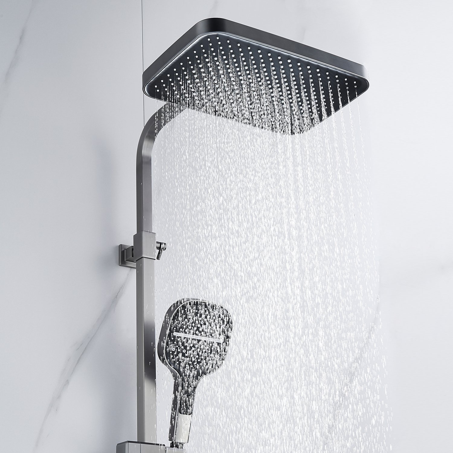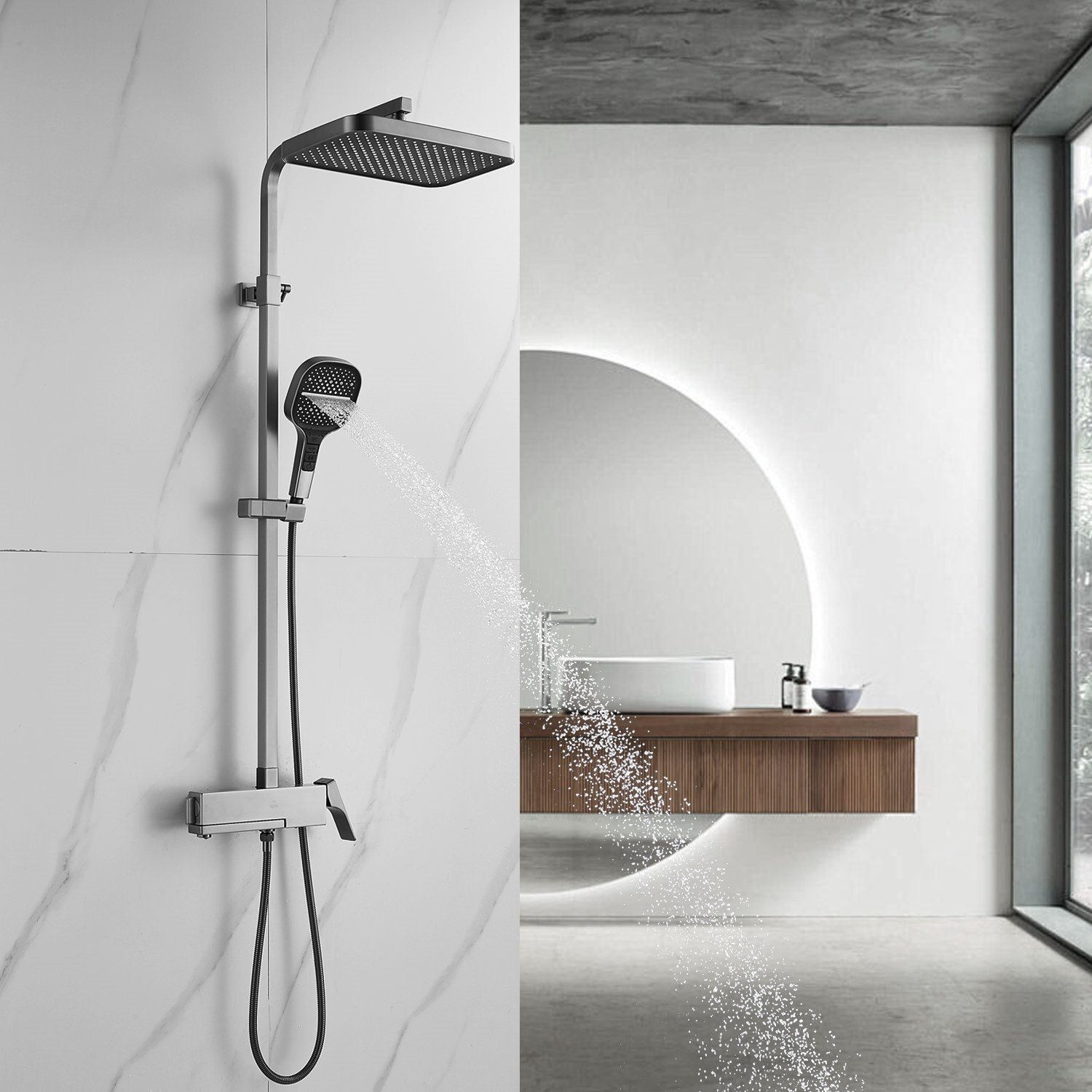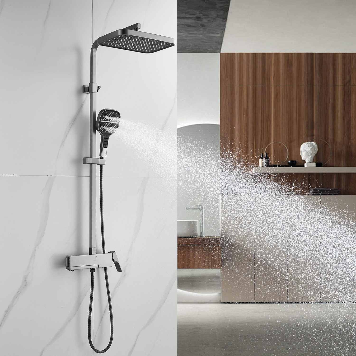 смеситель, верхний душ, штанга с держателем душевой лейки, душевая лейка, шланг, эксцентрики