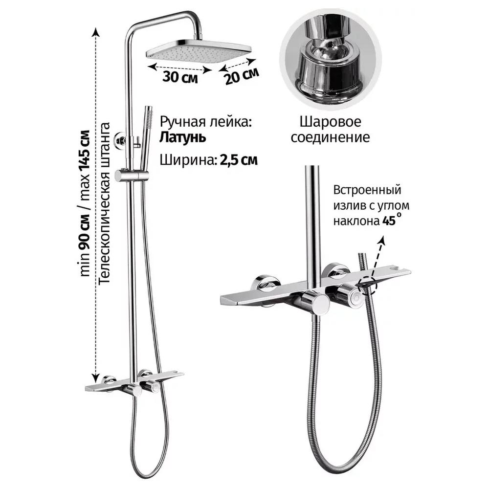 верхний душ, душевая штанга с держателем лейки, ручной душ, смеситель, шланг, эксцентрики, декоративные отражатели