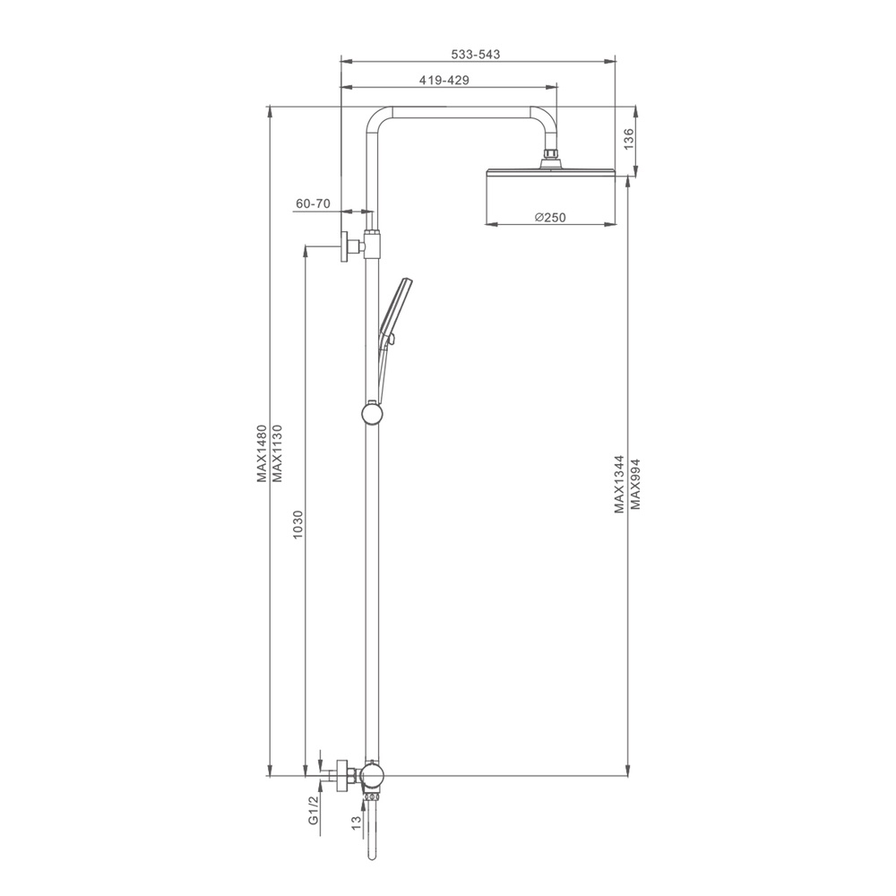 верхний душ, душевая штанга с держателем лейки, ручной душ, смеситель, шланг