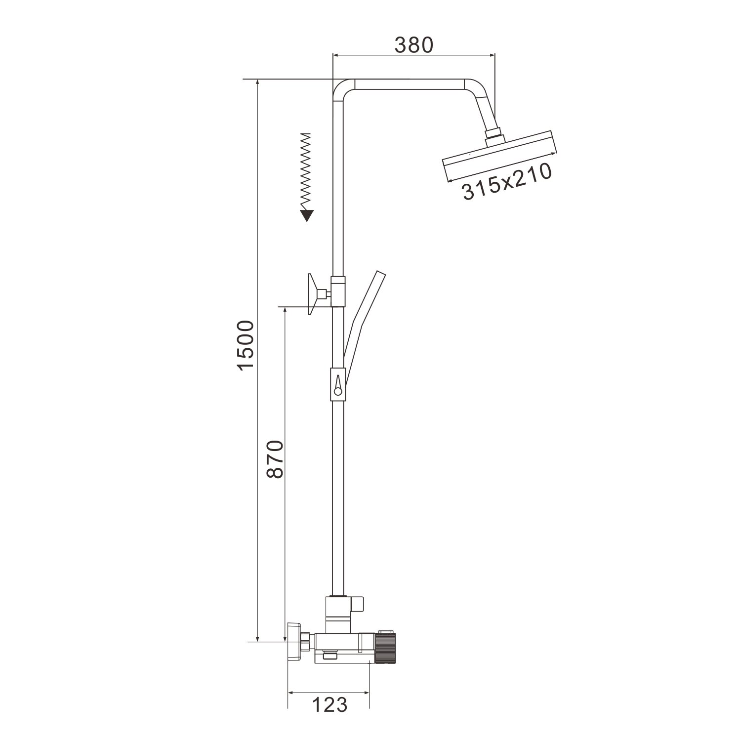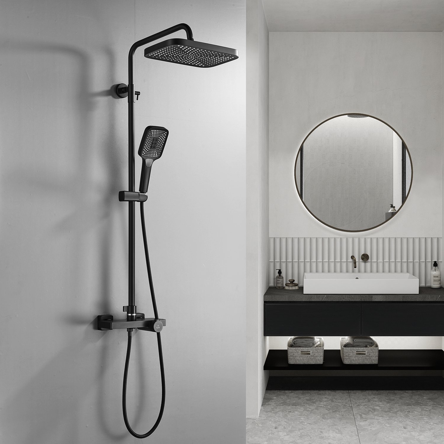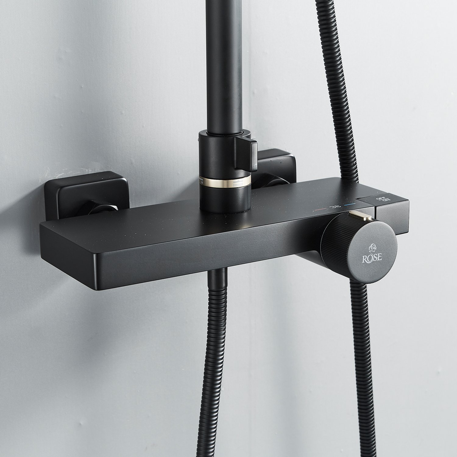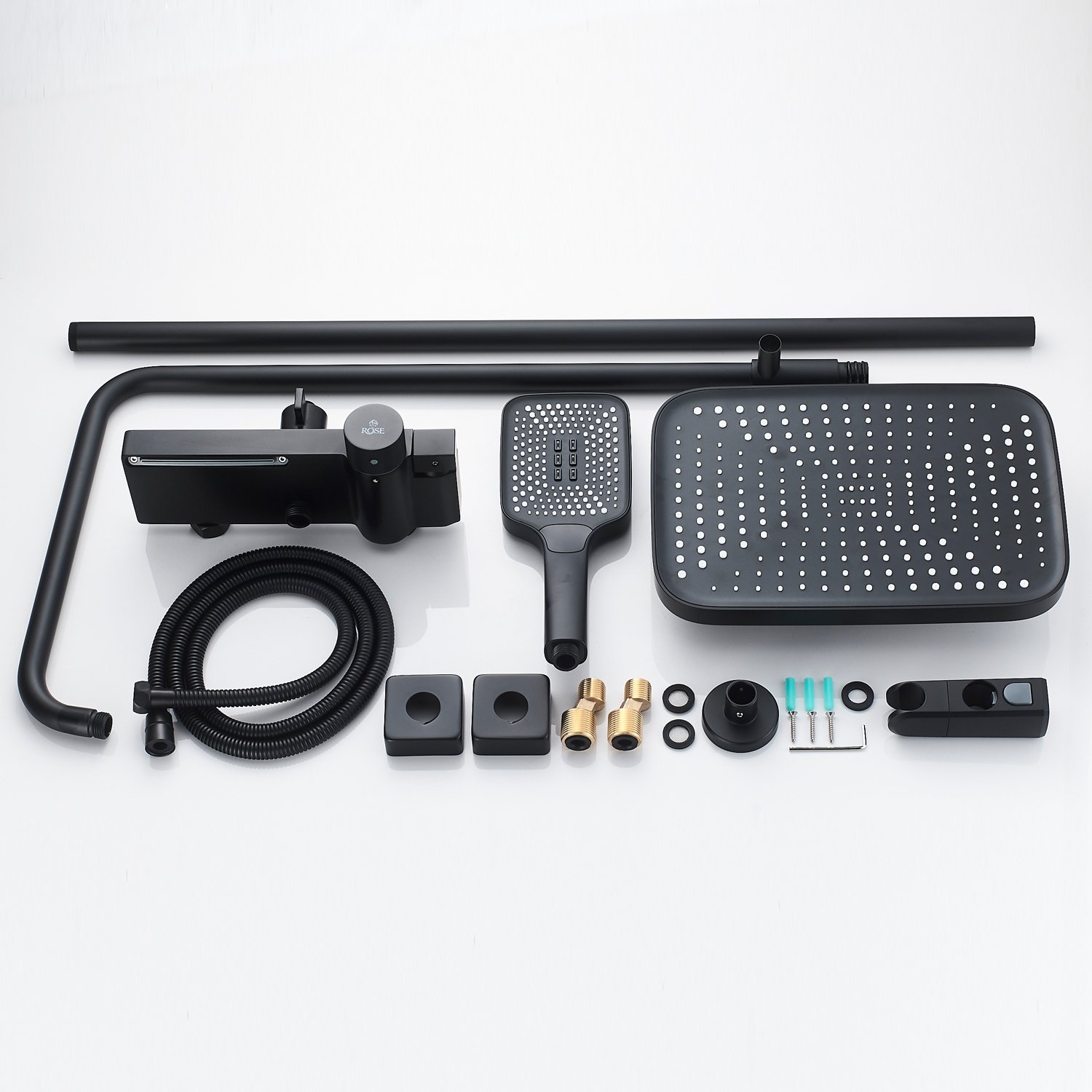 смеситель, верхний душ, штанга с держателем душевой лейки, душевая лейка, шланг, эксцентрики