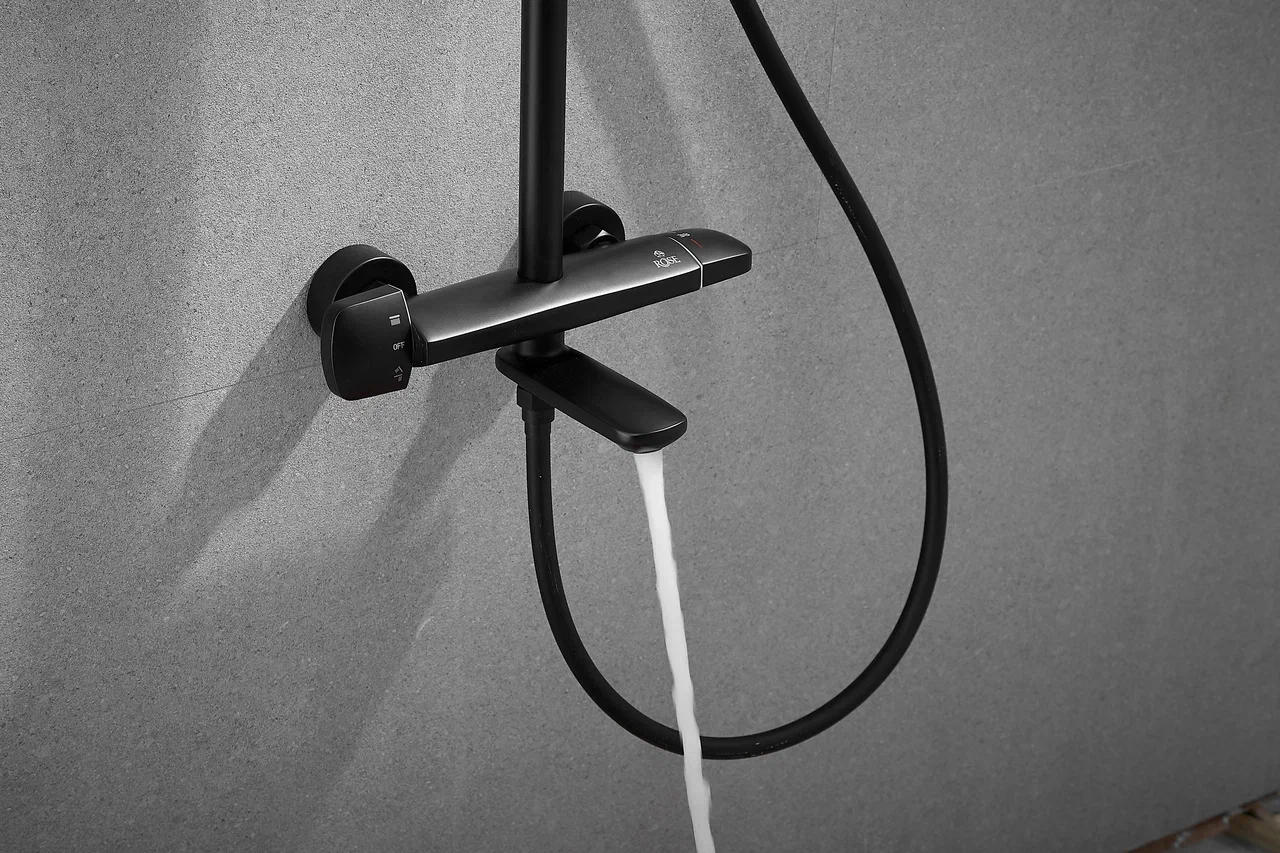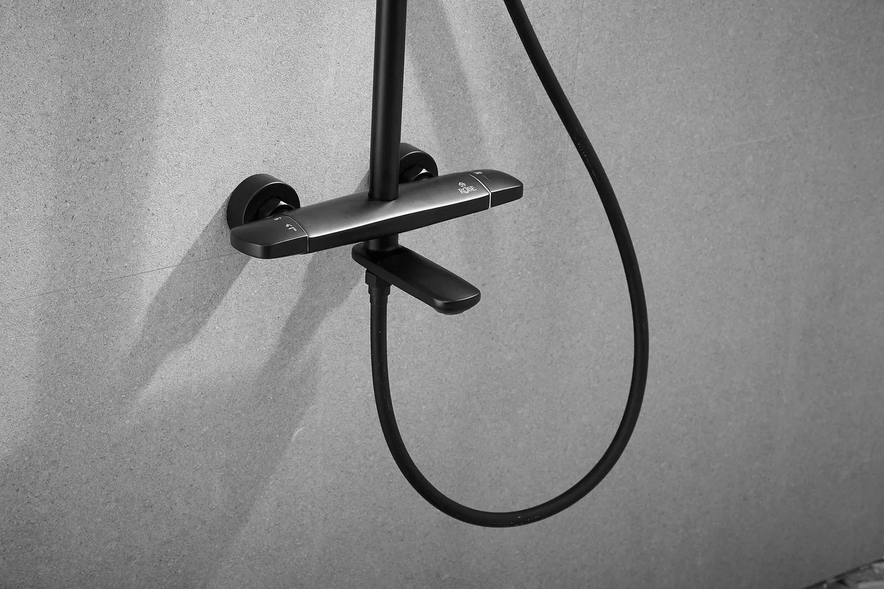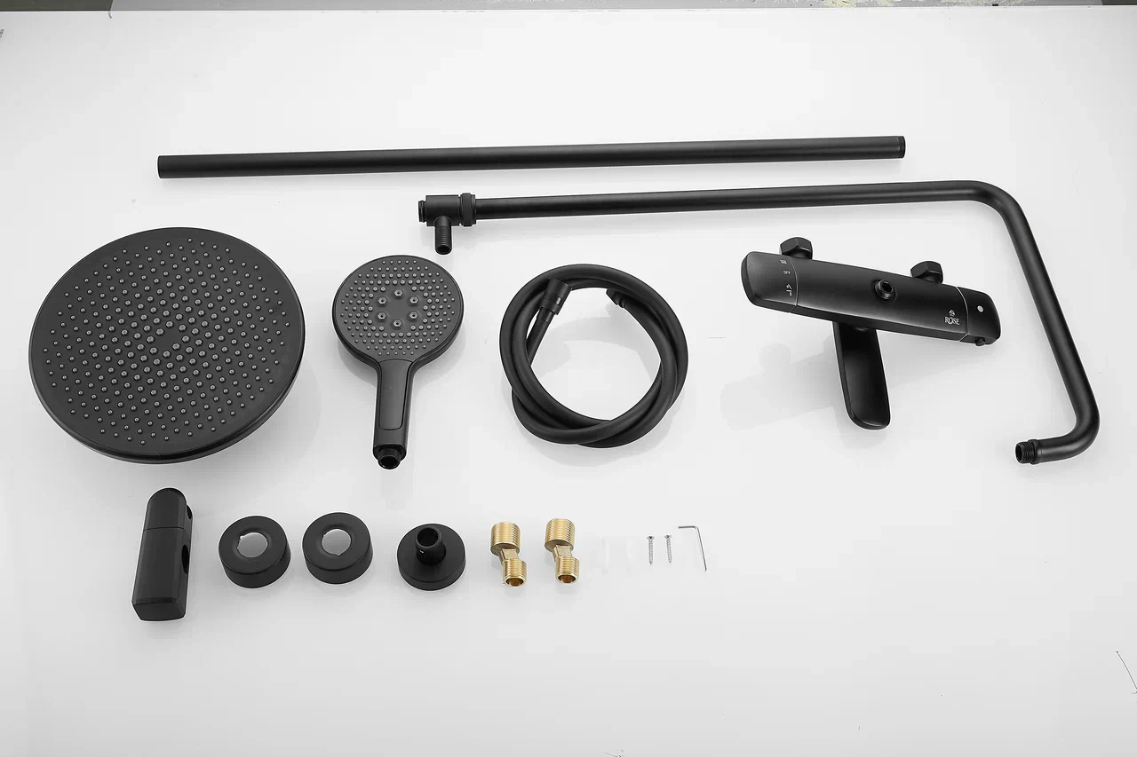 смеситель, верхний душ, штанга с держателем душевой лейки, душевая лейка, шланг, эксцентрики