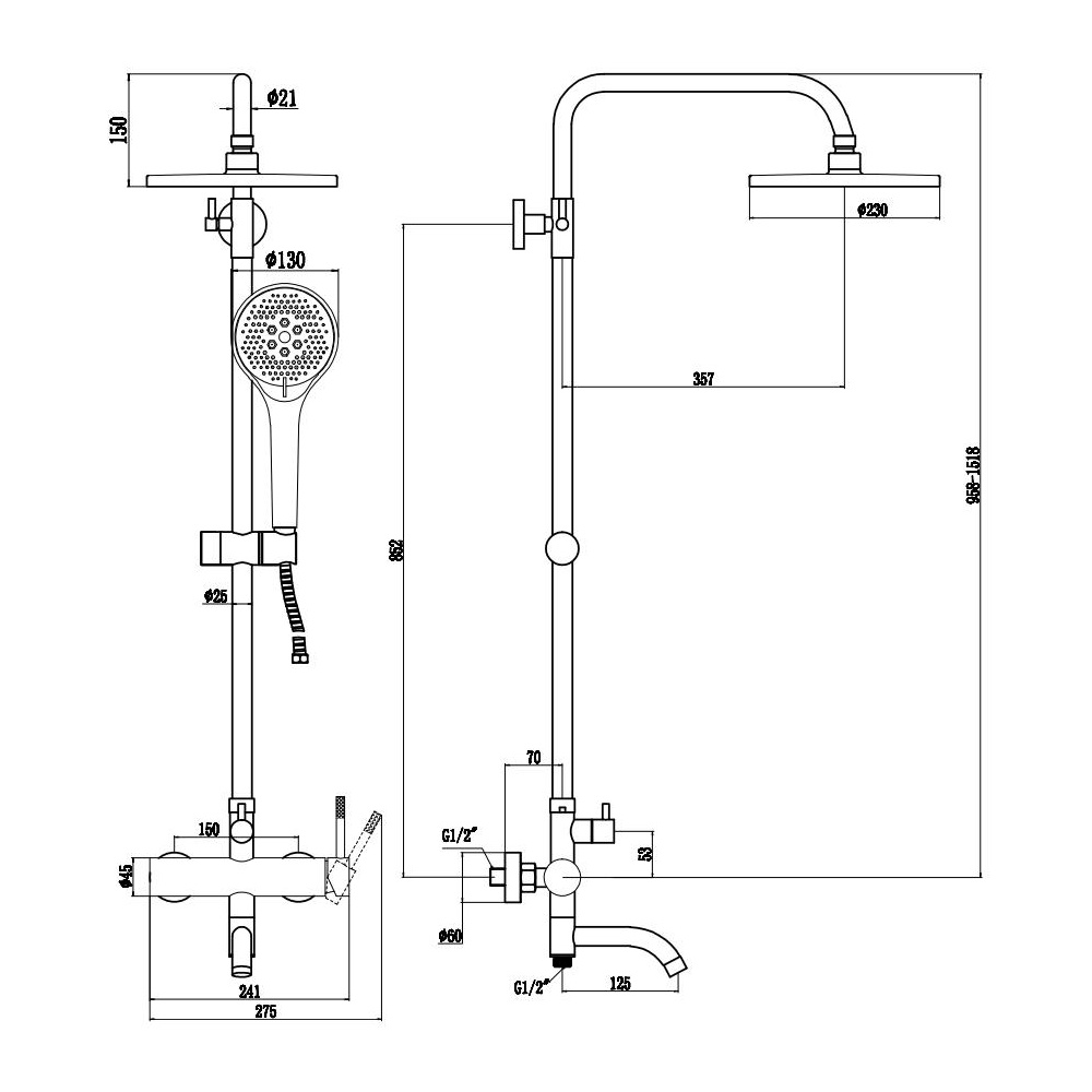 верхний душ, душевая штанга с держателем лейки, ручной душ, смеситель, шланг